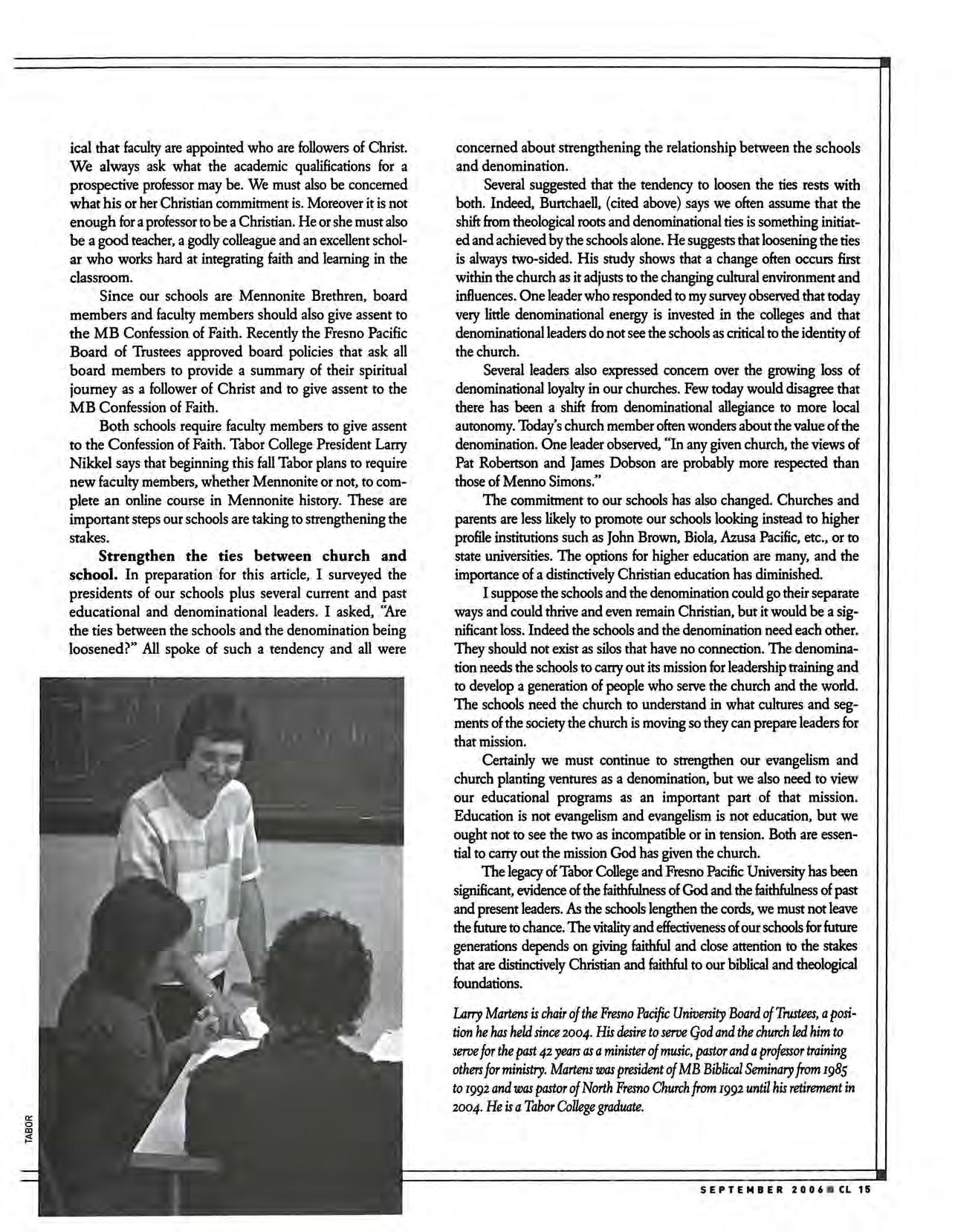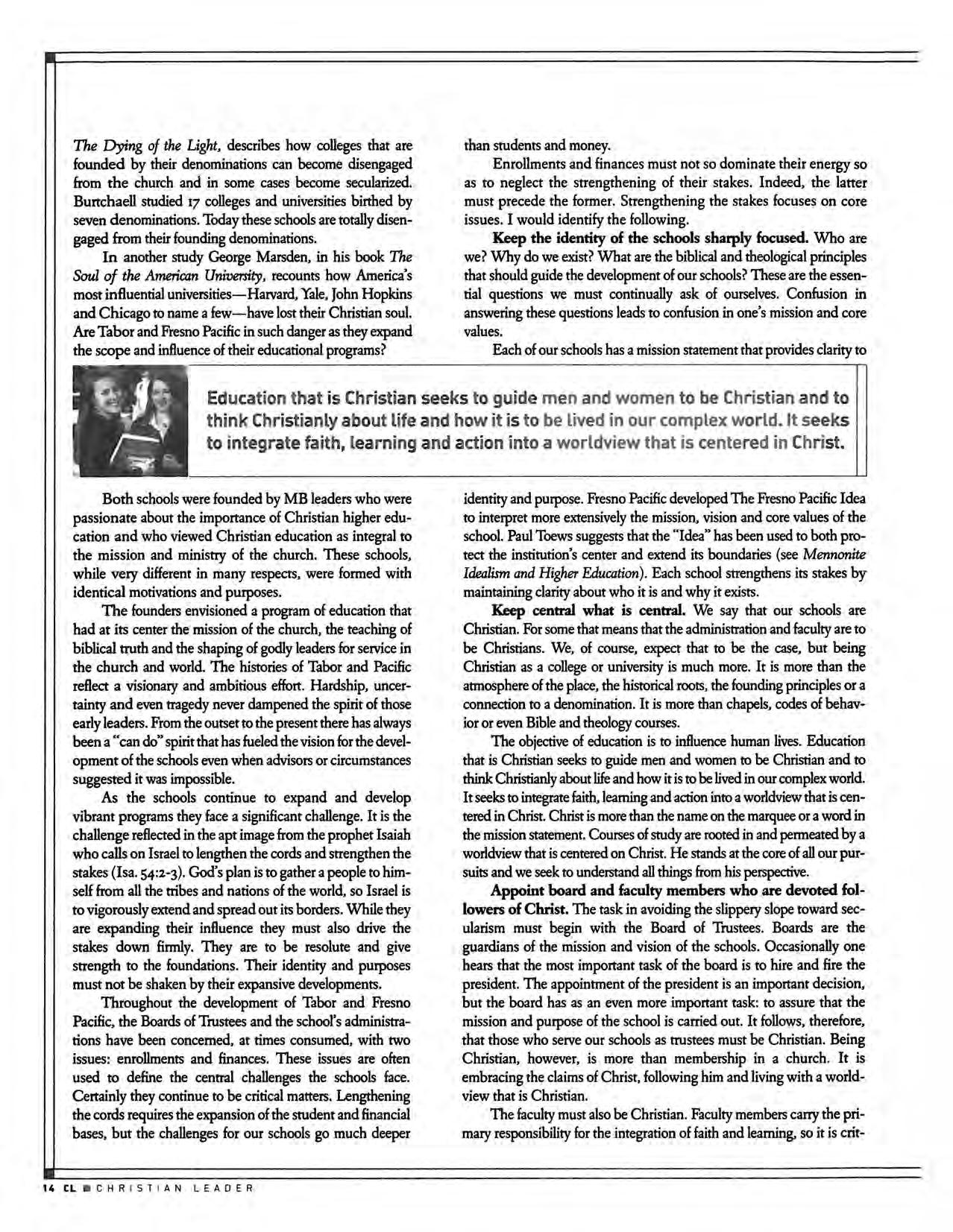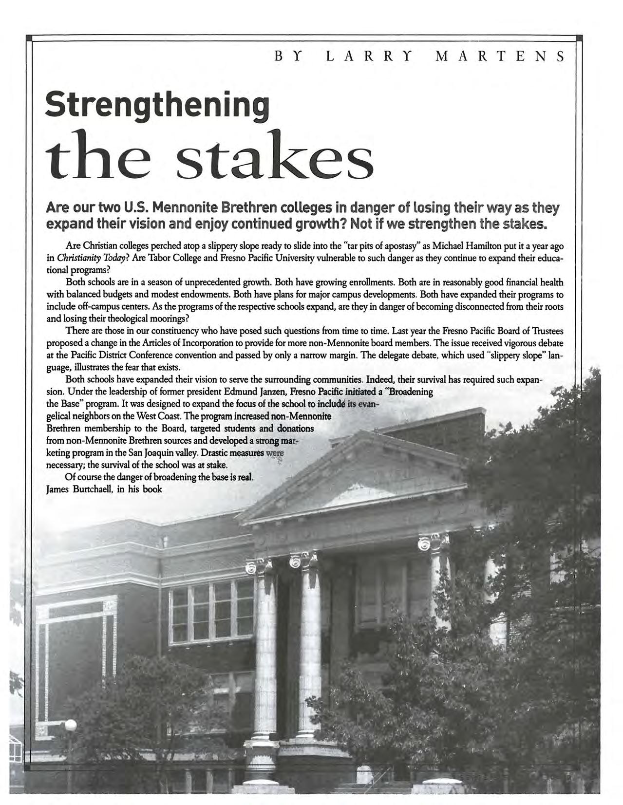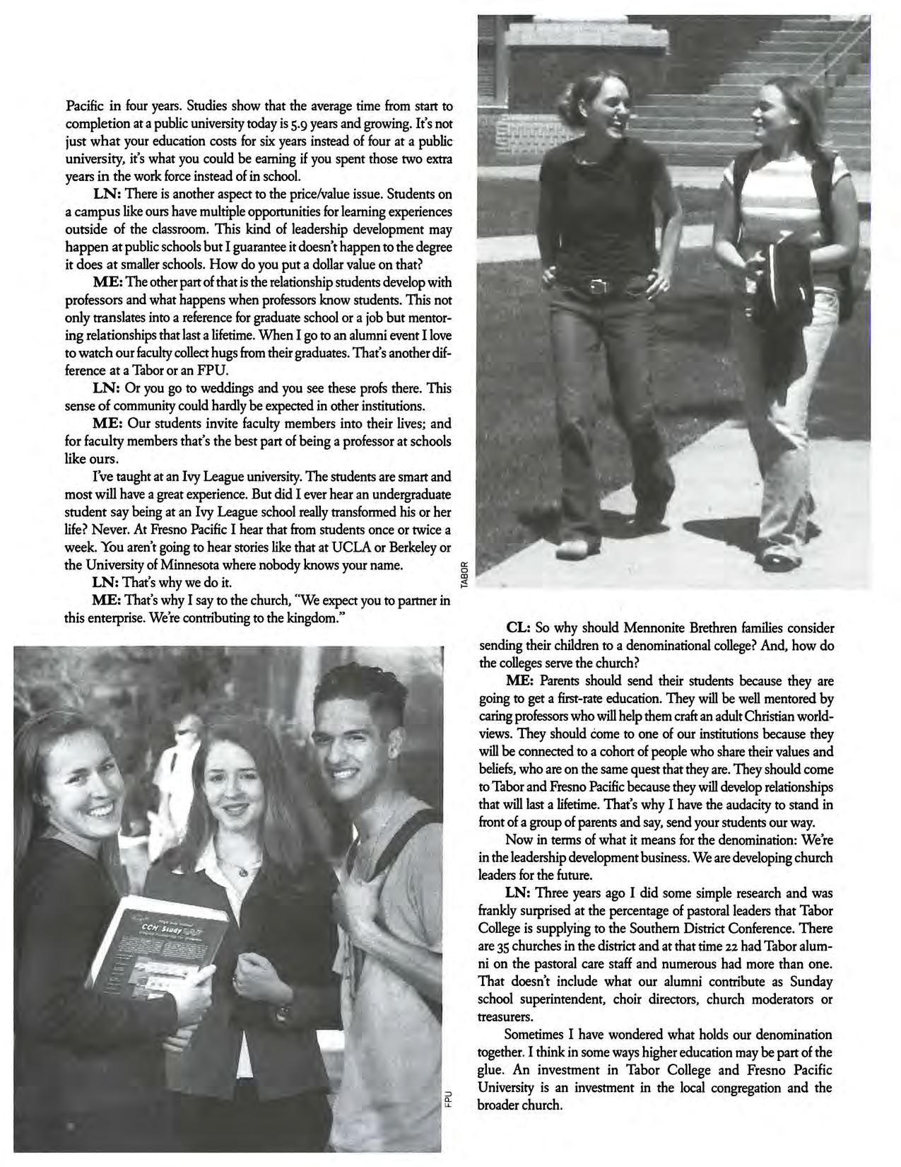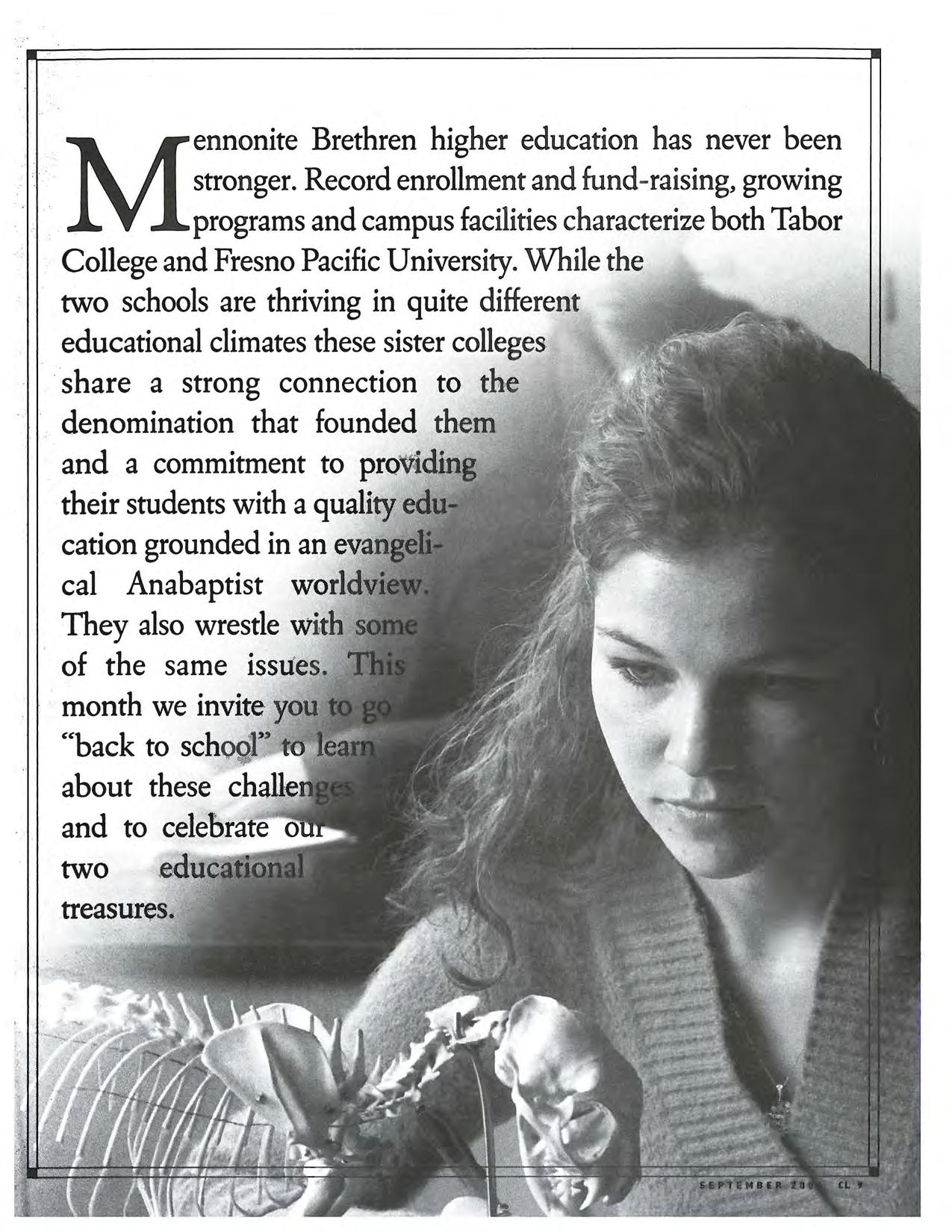 ennonite Brethren higher education has never been stronger. Record enrollment and fund - raising, growing programs and campus facilities characterize both Tabor College and Fresno Pacific University. While the two schools are thriving in quite different educational climates these sister colleges .share a strong connection to th e .' denomination that founded the m and a commitment to their students with a quality cation grounded in an cal Anabaptist world They also wrestle with of the same issues . . ' month we invite c;c;back to schogr' about these and to two