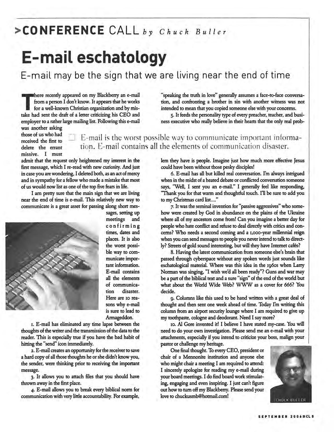 One final thought. To every CEO. president or chair of a Mennonite institution and anyone else who might chair a meeting I am required to attend: I sincerely apologize for reading my e-mail during your board meetings. I do find board work stimulating, engaging and even inspiring. I just can't figure out how to tum off my Blackberry. Please send your love to chuckusmb@hottnail.com!