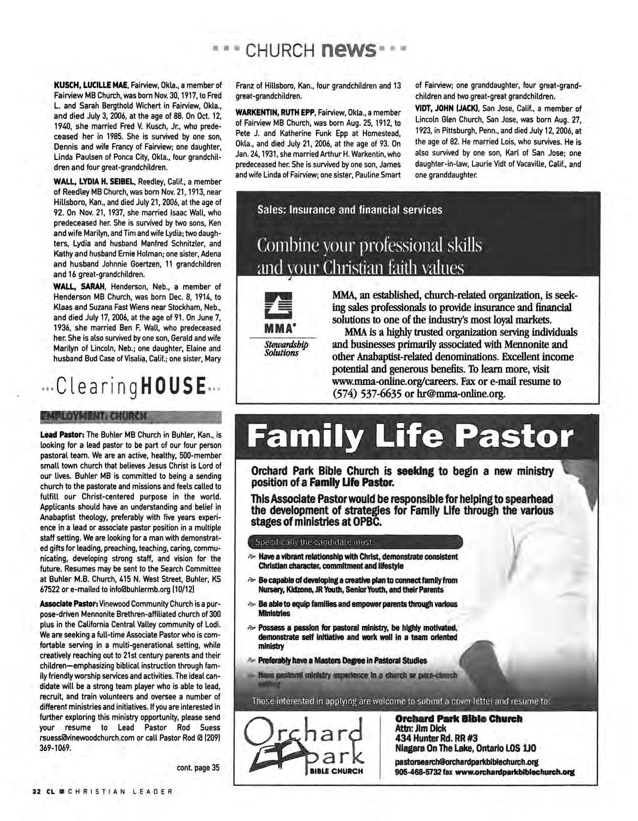 Lead Pastor: The Buhler MB Church in Buhler, Kan., is looking for a lead pastor to be part of our four person pastoral team. We are an active, healthy 500-member small town church that believes Jesus Christ is Lord of our lives. Buhler MB is committed to being a sending church to the pastorate and missions and feels called to fulfill our Christ-centered purpose in the world Applicants should have an understanding and belief in Anabaptist theology, preferably with five years experience in a lead or associate pastor position in a multiple staff setting. We are looking for a man with demonstrated gifts for leading, preaching, teaching , caring, communicating, developing strong staff, and vision for the future. Resumes may be sent to the Search Committee at Buhler M.B. Church, 415 N. West Street, Buhler, KS 67522 or e-mailed to infolilbuhlermb.org [10/121