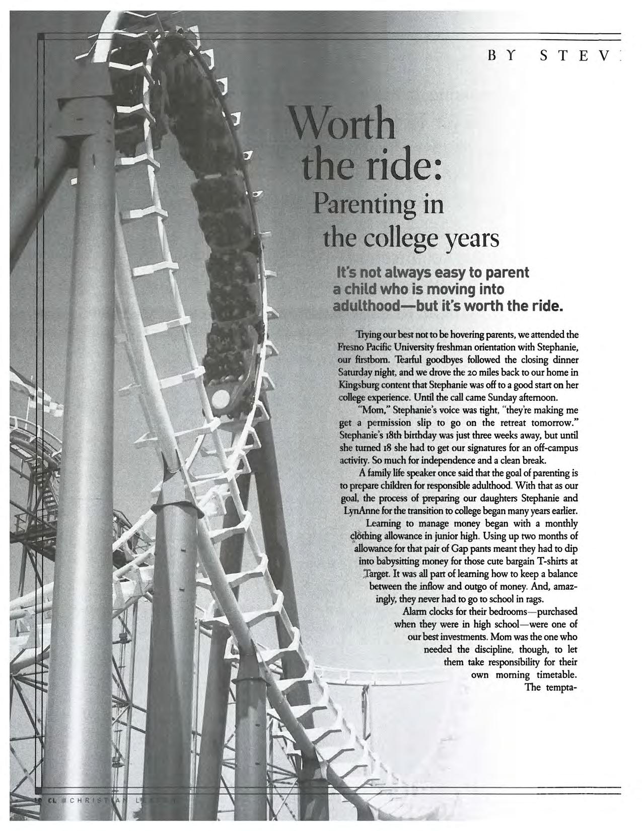 A family life speaker once said that the goal of parenting is to prepare children for responsible adulthood. With that as our goal. the process of preparing our daughters Stephanie and J¥tAnne for the transition to college began many years earlier. Learning to manage money began with a monthly aDow.lnce in junior high . Using up two months of altowante for that pair of Gap pants meant they had to dip into babysitting money for those cute bargain T-shirts at ,Target. It was all part of leaming how to keep a balance between the jnflow and outgo of money And, amazthey never had to go to school in rags.