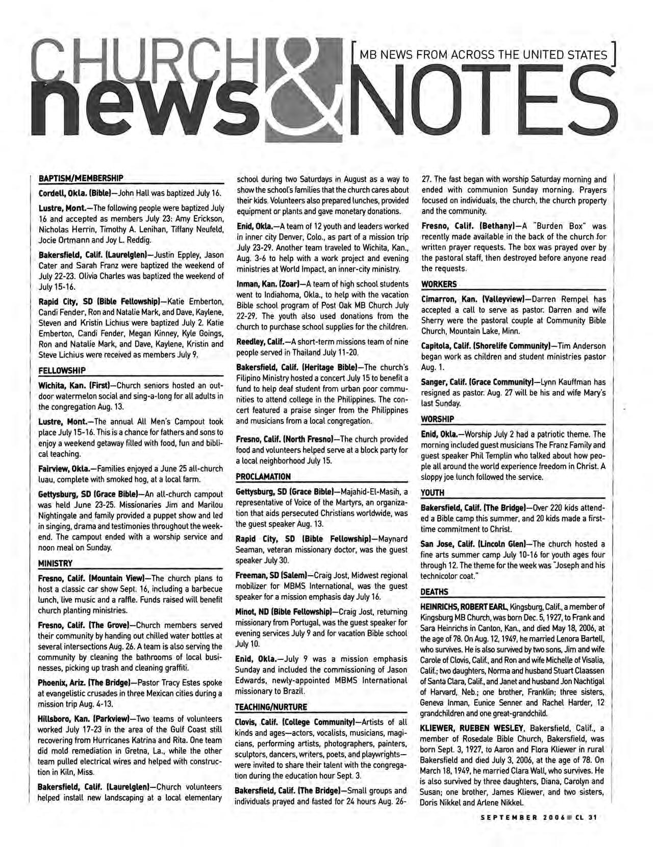 KLIEWER, RUEBEN WES LEY, Bakersfield, Calif., a member of Rosedale Bible Church, Bakersfield, was born Sept. 3, 1927, to Aaron and Flora Kliewer in rural Bakersfield and died July 3, 2006, at the age of 78. On March 18, 1949, he married Clara Wall, who survives. He is also survived by three daughters, Diana, Carolyn and Susan; one brother, James Kliewer, and two sisters, Doris Nikkel and Arlene Nikkel.