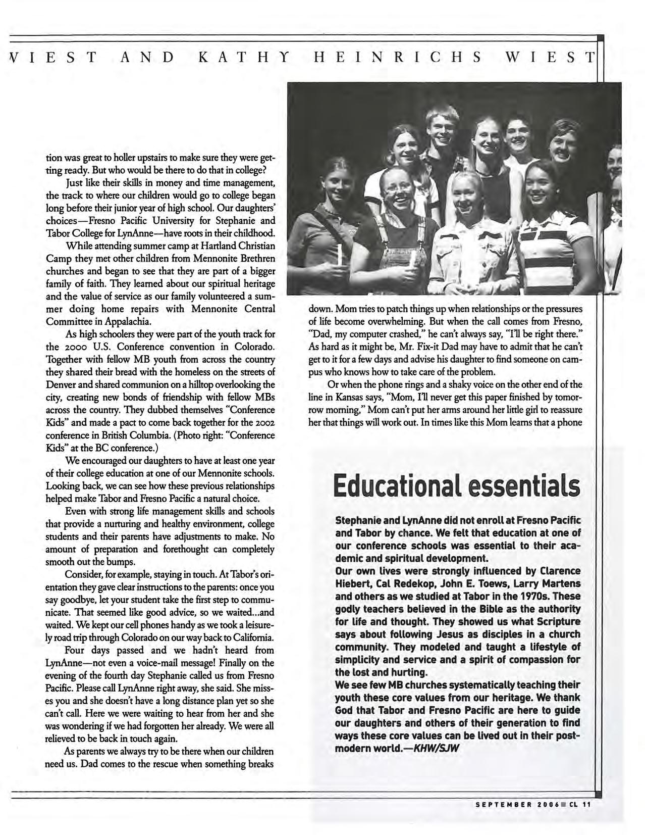 We encouraged our daughters to have at least one year of their college education at one of our Mennonite schools. Looking back, we can see how these previous relationships helped make Tabor and Fresno Pacific a natural choice.