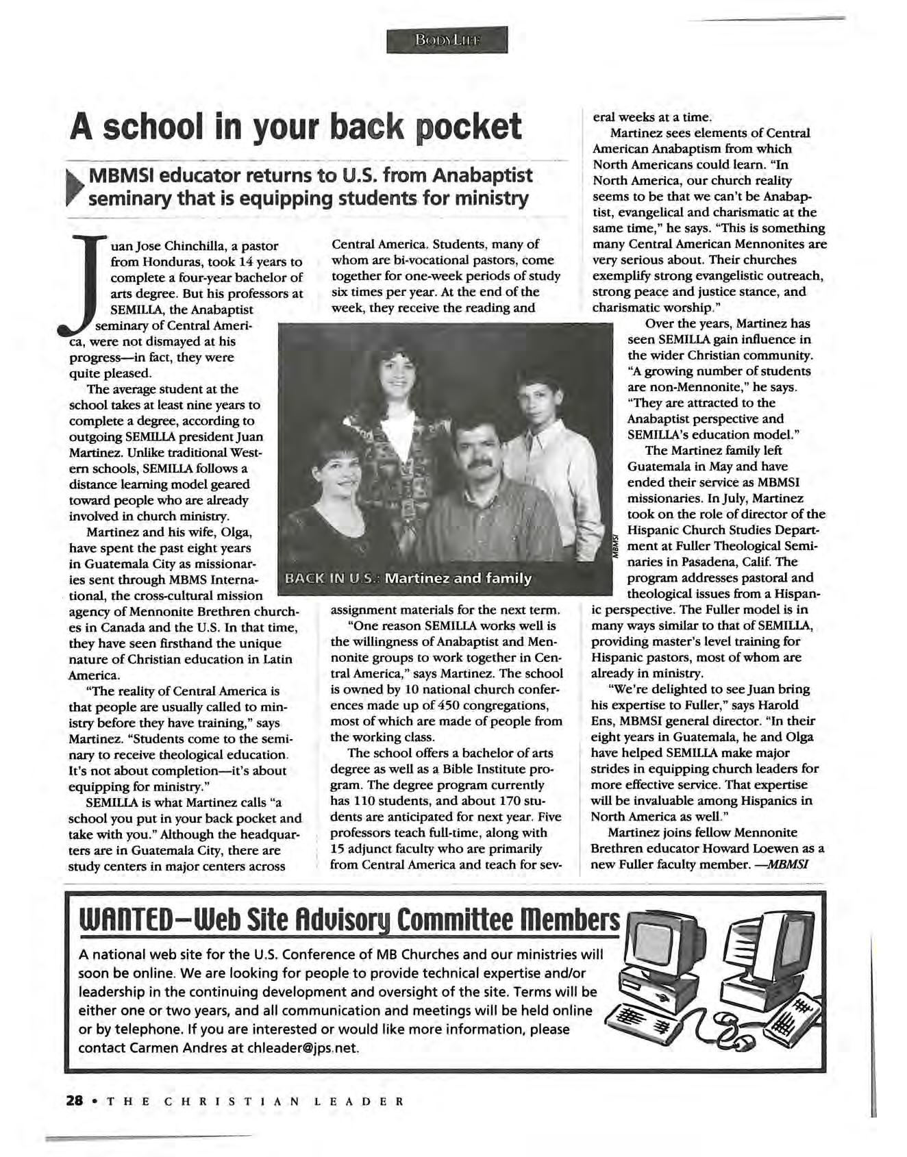 A national web site for the U.S. Conference of MB Churches and our ministries will soon be online. We are looking for people to provide technical expertise and/or leadership in the continuing development and oversight of the site. Terms will be either one or two years, and all communication and meetings will be held online or by telephone. If you are interested or would like more information, please contact Carmen Andres at chleader@jps.net.
