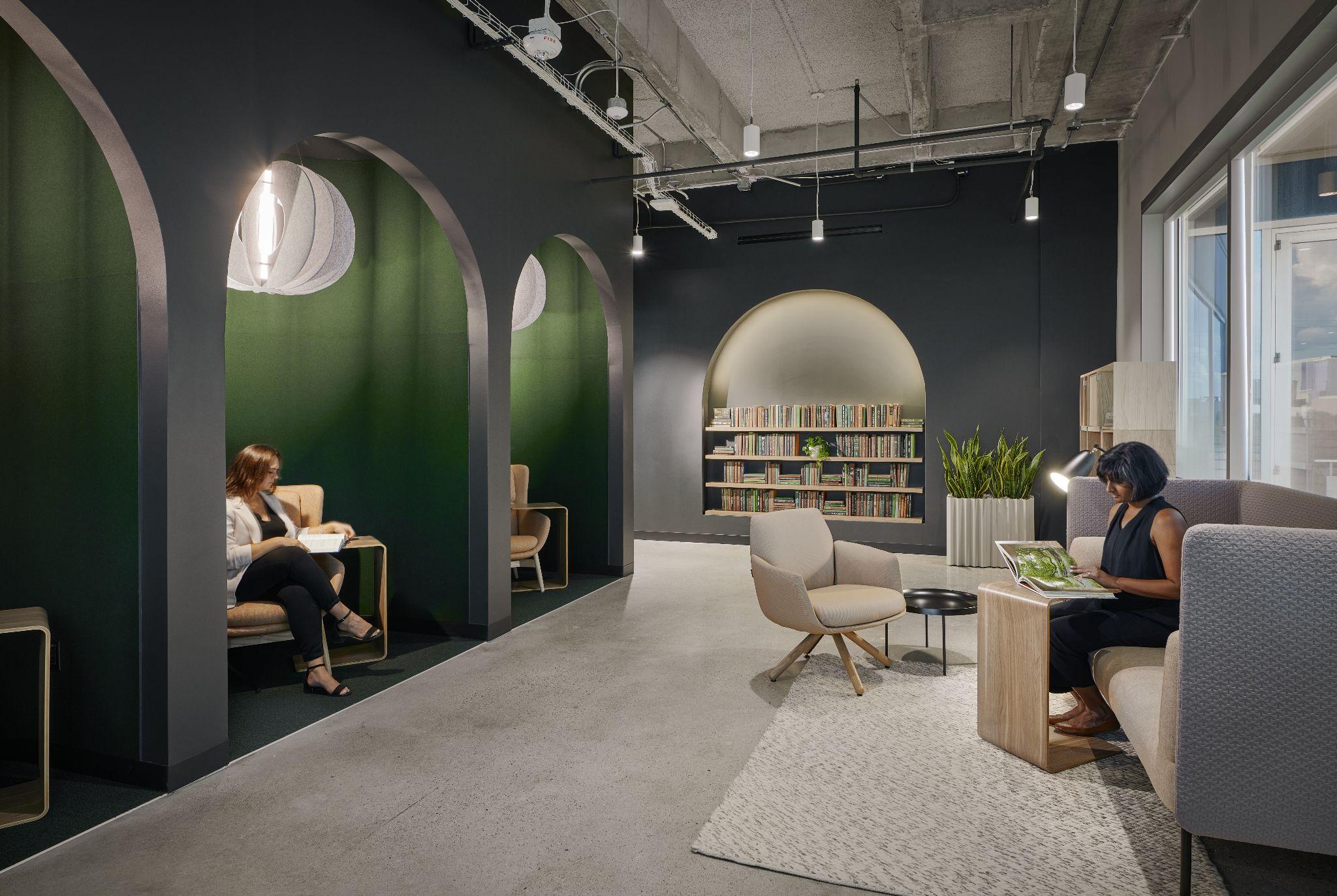 Hospitality-focused design features balance cozy and modern design to create a mature, refined aesthetic with a sense of lightness and expansiveness. The open-concept workspace features rounded furniture to match the ‘music wave’pattern of the building's architecture and responds to seasonal staffing shifts with the flexibility to scale up or down quickly.