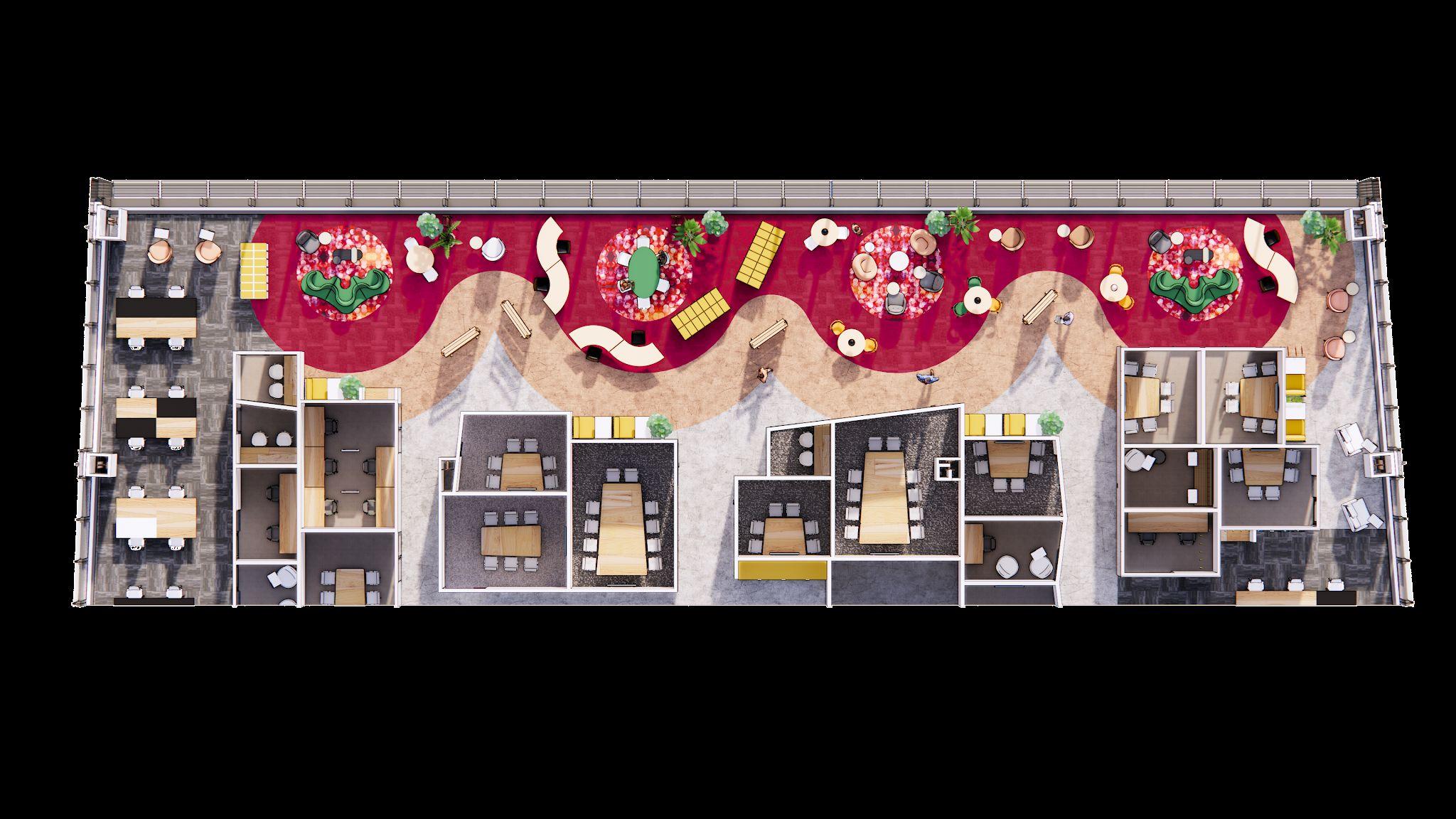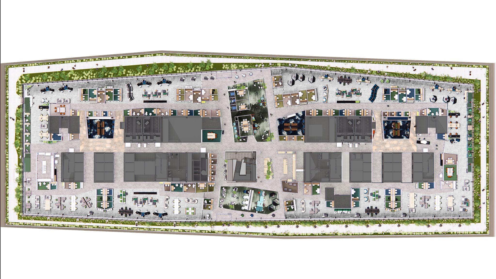 St. John’sTerminal redefines workplace design by integrating flexibility, innovation, and sustainability into a vibrant and adaptable environment.The project features alternative work areas surrounded by expansive landscaped terraces and a variety of amenity spaces, including a rooftop garden, grand stair, indoor and outdoor event spaces, a library, a theater, and multiple micro kitchens and cafes. Each workplace floor incorporates two alternative work areas situated on the north and south sides of the building, designed with contrasting concepts such as “light and shadow” or “simple and complex.”These areas converge at a central hub, fostering balance and interaction among employees.