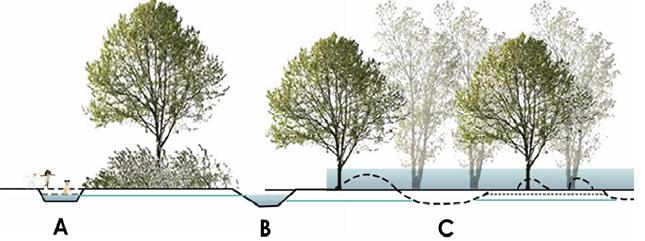 5. In zone 5, water is filtered and stored in pits. During heavy rain and floods, the 18 bioswales fill up one by one as the water level rises, helping prevent flooding.