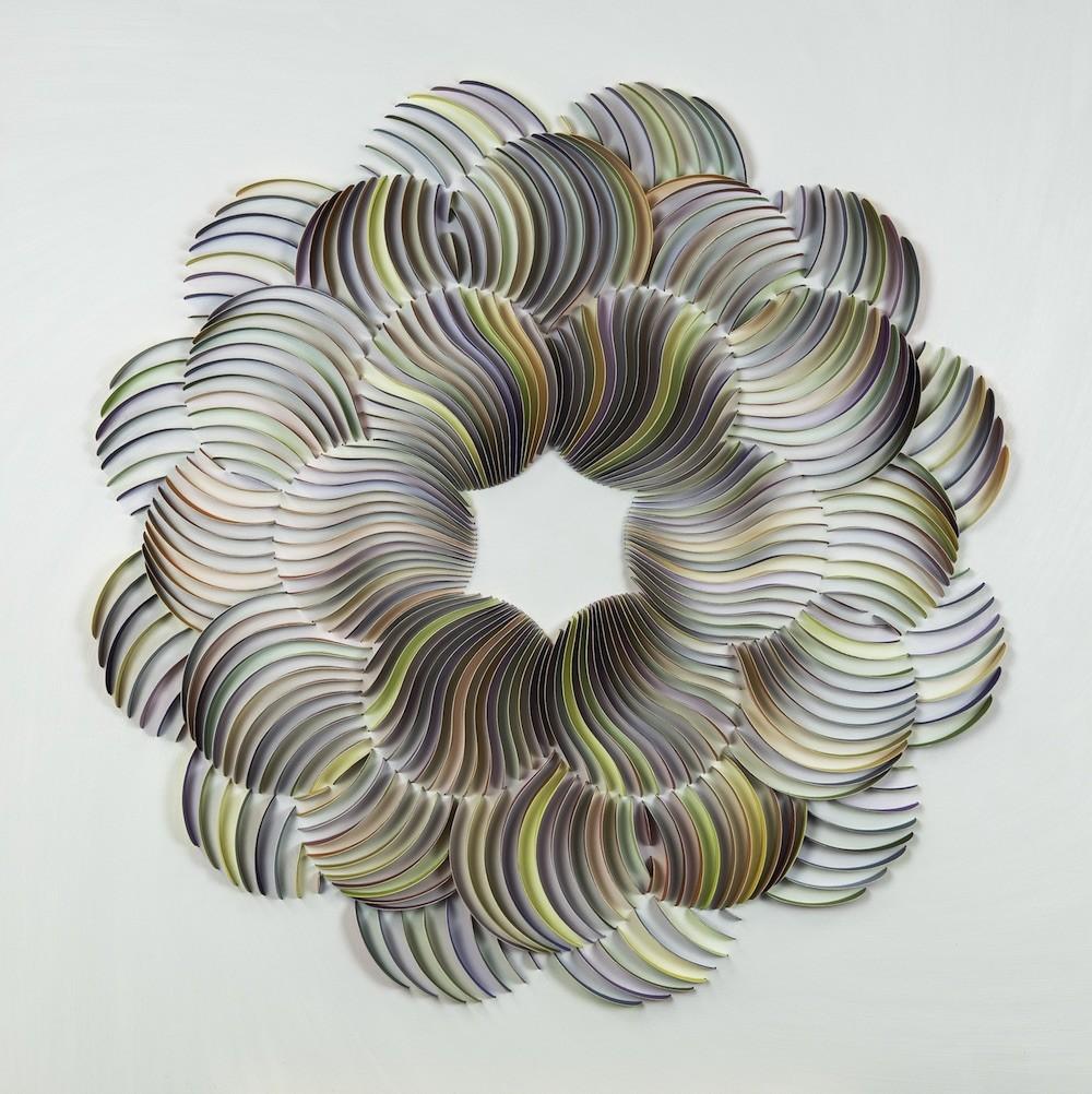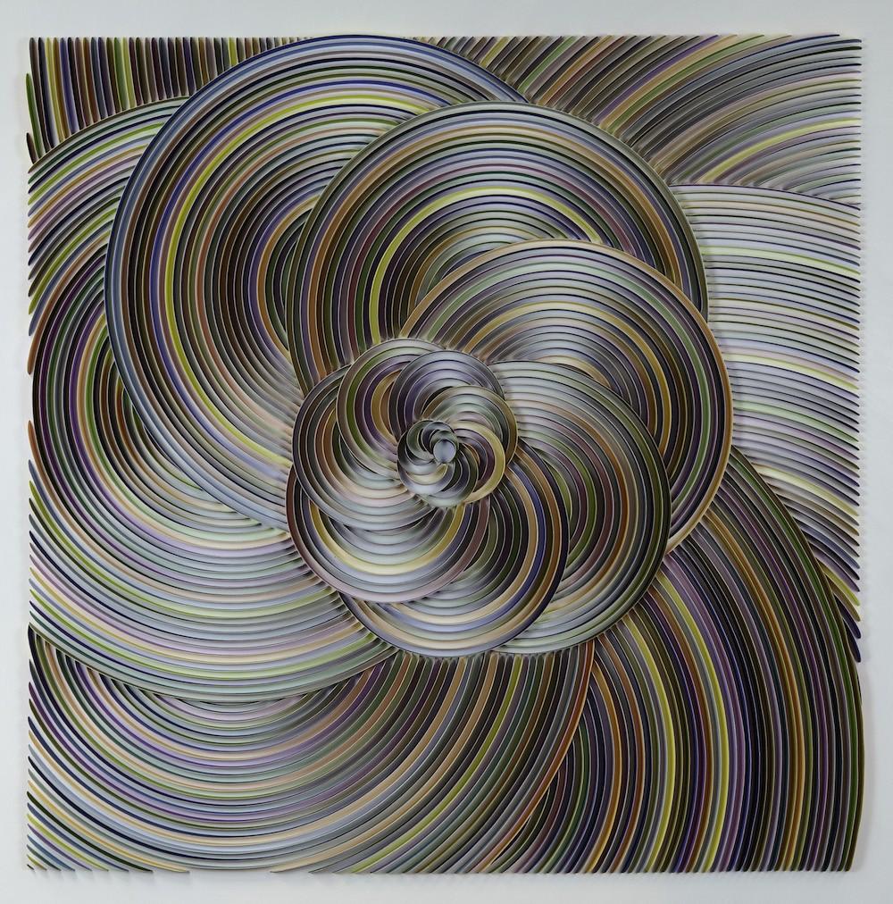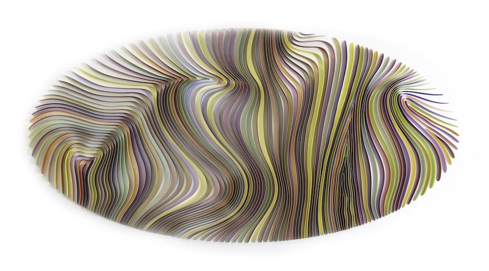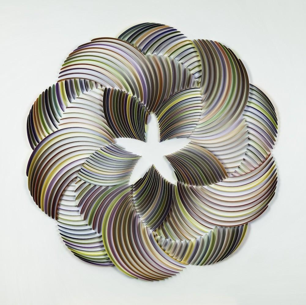 Dublin-based artist Peter Monaghan returns to the gallery with new work informed by his graphic design sensibility. For over twenty years Monaghan ran a successful business as a graphic designer before dedicating himself full time to the fine arts. In the twenty-five years since, Monaghan has translated his calligraphic and sculptural skills into the three- dimensional works for which he is known. Referencing patterns seen in nature, mathematics, music and movement, Monaghan’s color and forms get activated as the viewer shifts position. For this exhibition, Monaghan has created a new body of work made with watercolor on paper arranged in complex radial or wavy motifs. The patterns turn in and away from each other, which while thoroughly structured, allow for unexpected visual outcomes that will delight viewers.