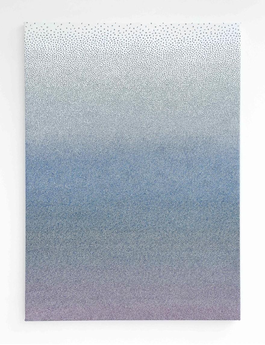 The artist continues stamping the canvas surface with painted “I and 0” until they meld into accretion of color field gradations. The end results are beautiful colorfield paintings made of tiny characters that only become apparent up close. More recent works reference the colors and forms in nature around her new surroundings in the Hautes-Pyrénées in France. Originally from Cape Town, South Africa, Broekhyusen earned her BFA from the ELAM School on Fine Arts, Auckland University in New Zealand. Her paintings have been the subject of many solo and group exhibitions in Europe, Asia, and the Americas, and are in multiple collections including the Microsoft Art Collection and the Aria Fine Art Collection.