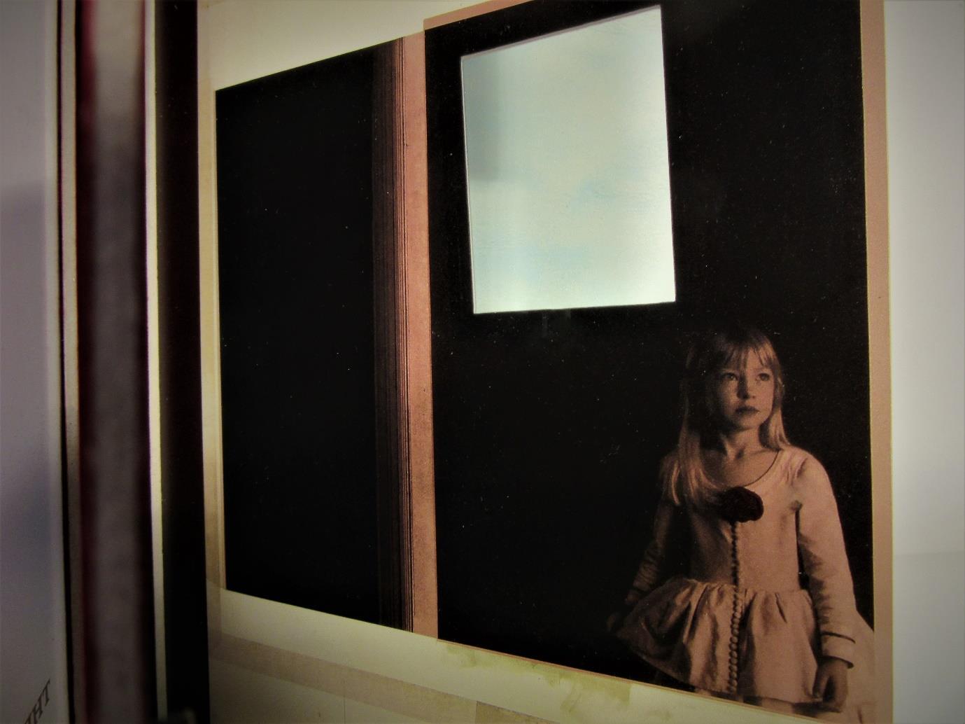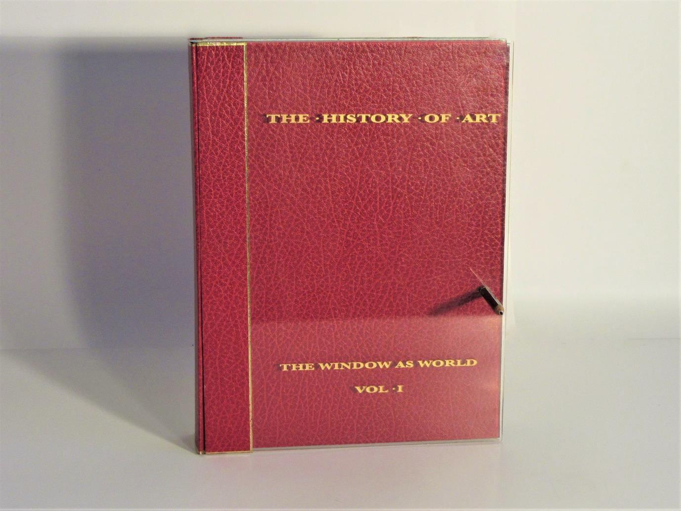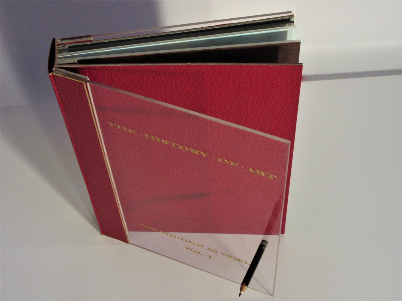 In The History of Art Vol.1: The Window as World. the framed ‘image’ is treated as ‘real’ window as the transparent property intrinsic to the perspex surface is utilized. In the foreground of the image is a photographic representation of a young girl enacting the role of the Princess Margherita. She is depicted in a pose and dress reminiscent of the princess in the painting Las Meninas. Through the clear ‘window’ the viewer glimpses the blue sky printed on the following ‘page’.