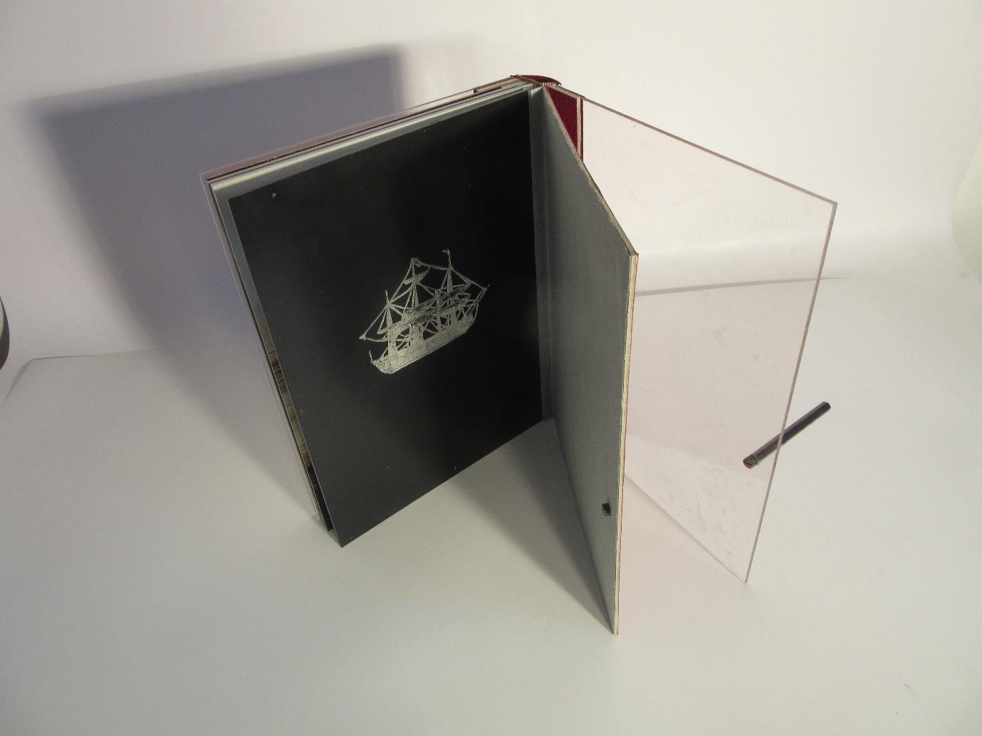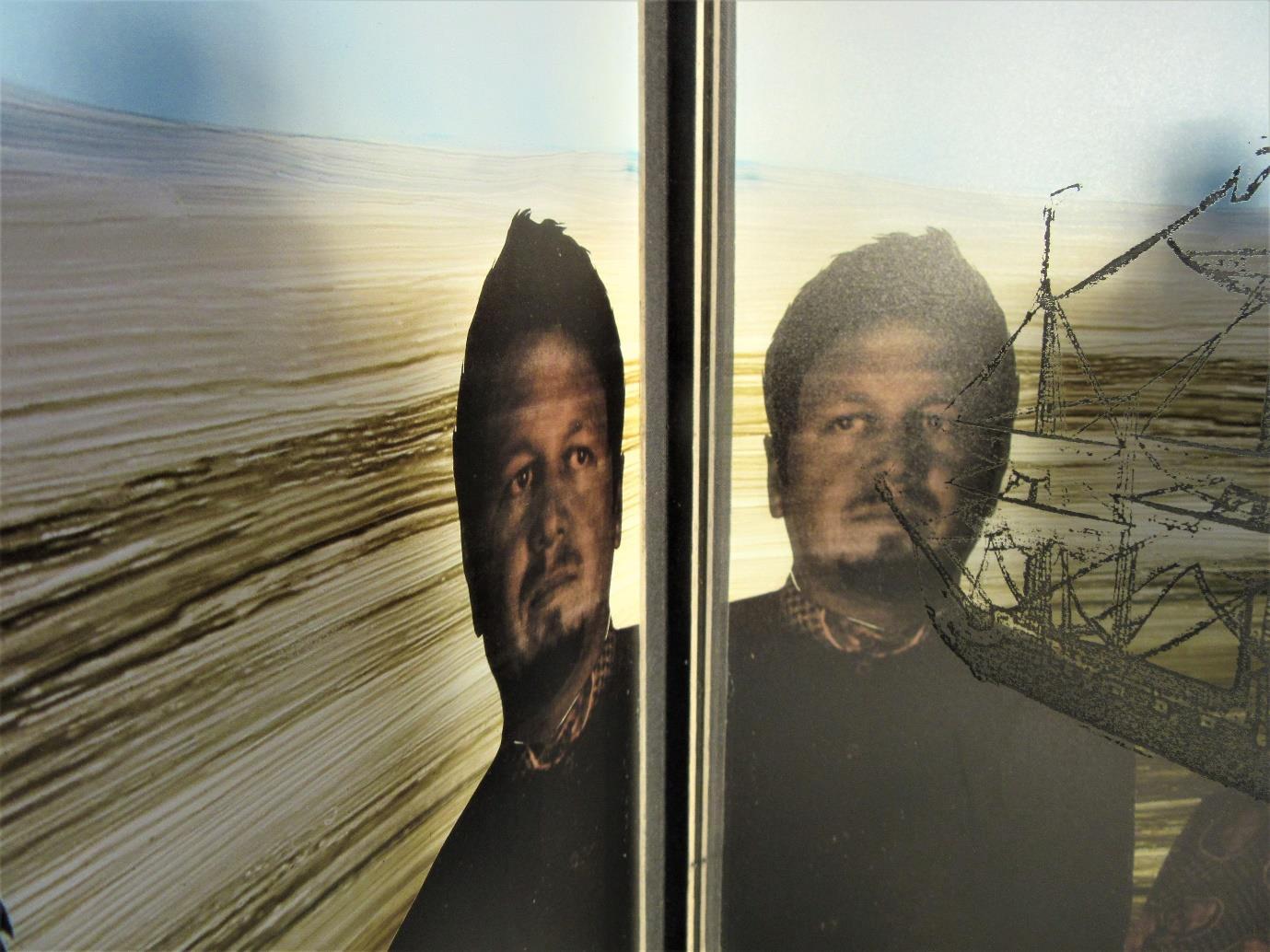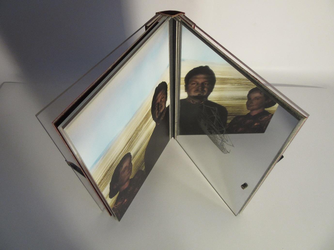In The History of Art Vol.1: The Window as World. the framed ‘image’ is treated as ‘real’ window as the transparent property intrinsic to the perspex surface is utilized. In the foreground of the image is a photographic representation of a young girl enacting the role of the Princess Margherita. She is depicted in a pose and dress reminiscent of the princess in the painting Las Meninas. Through the clear ‘window’ the viewer glimpses the blue sky printed on the following ‘page’.