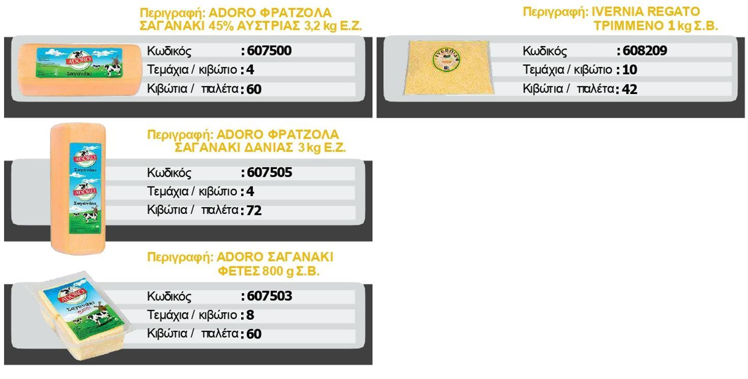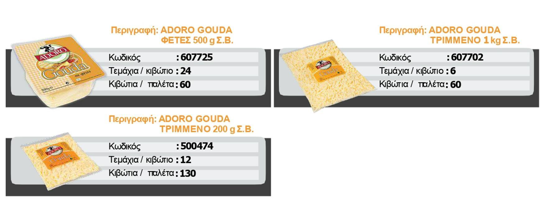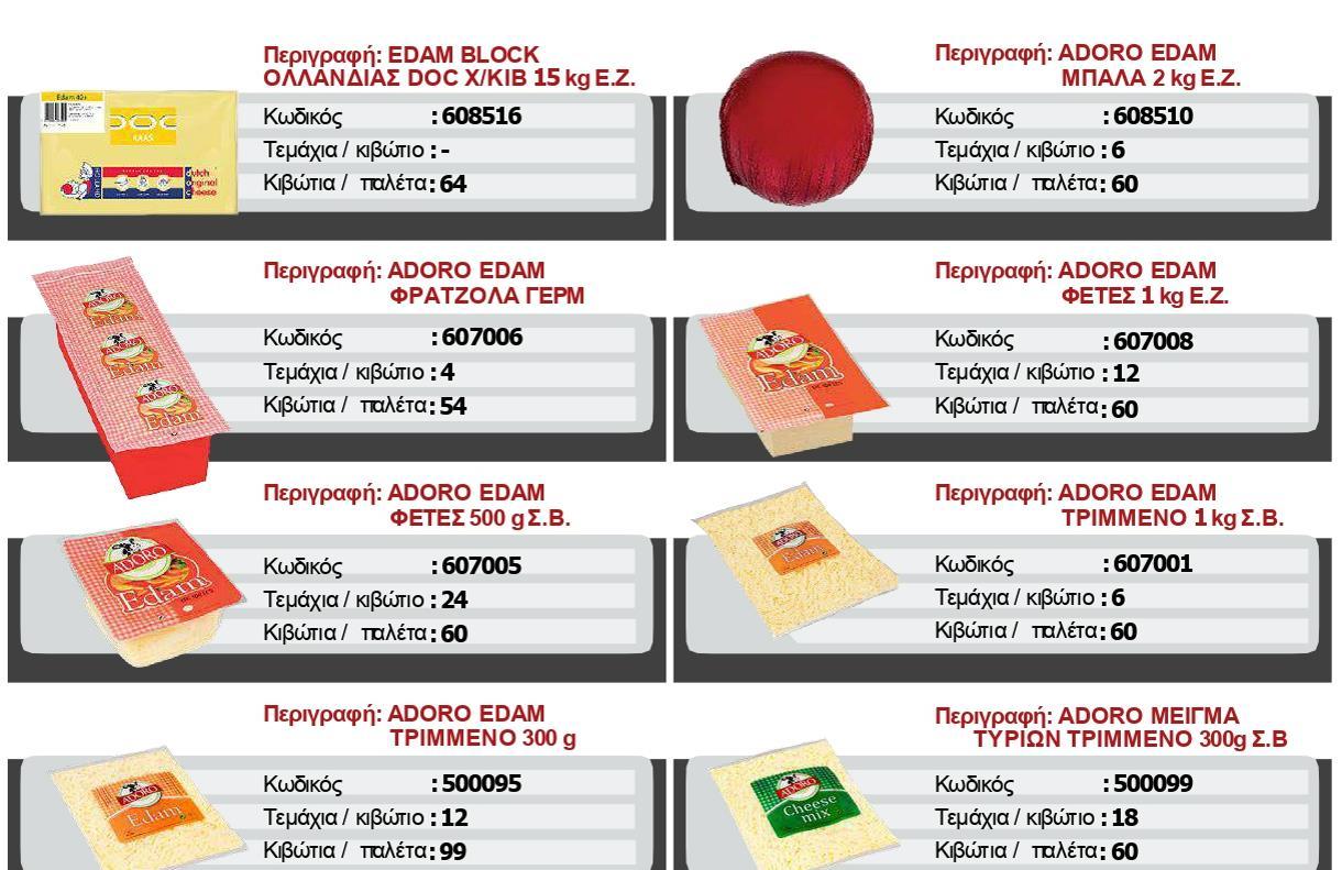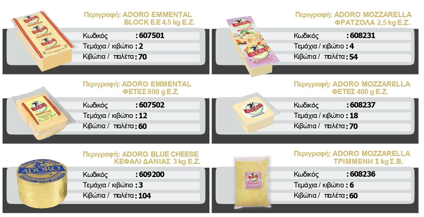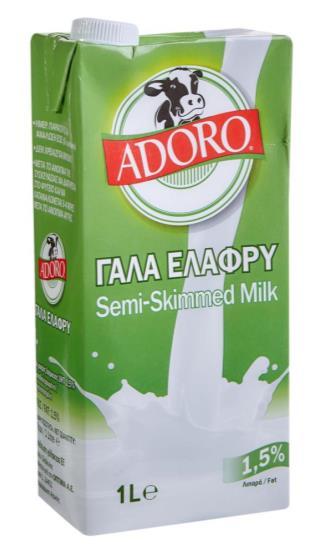 161 ΠΕΡΙΓΡΑΦΗ ΕΙΔΟΥΣ ΣΥΣΚΕΥΑΣΙΑ 901856 NOVO GOBARISTA ΓΑΛΑ 1% 12x1lt 01.20030 ΓΑΛΑ ADORO ΜΠΛΕ EASY OPEN 3,5% 12X1LT 04.166 ΓΑΛΑ ADORO ΠΡΑΣΙΝΟ EASY OPEN 1,5% 12x1LT 01.80196 ΓΑΛΑ ADORO ΜΕΡΙΔΑ 50x10x15g 01.80195 ΓΑΛΑ ADORO ΕΒΑΠΟΡΕ ΧΑΡΤΙΝΟ 12x500ML 12.098 ADORO ΚΡΕΜΑ ΓΑΛΑΚΤΟΣ 35% easy open 12x1LT 500422 ADORO ΤΥΡΙ ΚΡΕΜΑ 4x2kg 740110 ΠΡΟΙΟΝ ΓΙΑ ΜΑΓΕΙΡΙΚΗ FANTASTICA CHEF ΙΤΑΛΙΑΣ 12x1lt 300181 CUCCINA ΚΡΕΜ ΦΥΤ ΜΑΓ 23% 12x1kg