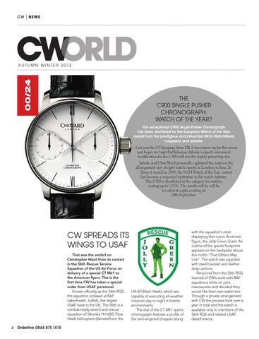 CW SPREADS ITS WINGS TO USAF That was the verdict on Christopher Ward from its contact in the 56th Rescue Service Squadron of the US Air Force on delivery of a special C7 Mk1 to the American flyers. This is the first time CW has taken a special order from USAF personnel. Known officially as the 56th RQS, the squadron is based at RAF Lakenheath, Suffolk, the largest USAF base in the UK. The 56th is a combat-ready search and rescue squadron of Sikorsky HH-60G Pave Hawk helicopters (derived from the 2