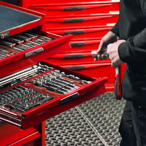 En komplett verktøyvogn som inneholder 417 deler. Verktøyet er fordelt i skuffer med EVA-skum i lag med tre ulike farger, som holder verktøyet på plass og gjør det lett å se om noe mangler. Alle boksene har avtagbare lokk.