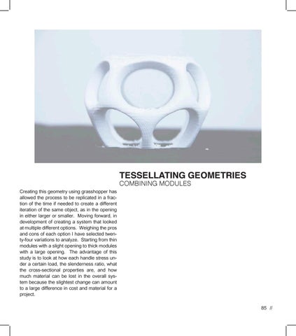 TESSELLATING GEOMETRIES Creating this geometry using grasshopper has allowed the process to be replicated in a fraction of the time if needed to create a different iteration of the same object, as in the opening in either larger or smaller. Moving forward, in development of creating a system that looked at multiple different options. Weighing the pros and cons of each option I have selected twenty-four variations to analyze. Starting from thin modules with a slight opening to thick modules with a large opening. The advantage of this study is to look at how each handle stress under a certain load, the slenderness ratio, what the cross-sectional properties are, and how much material can be lost in the overall system because the slightest change can amount to a large difference in cost and material for a project.