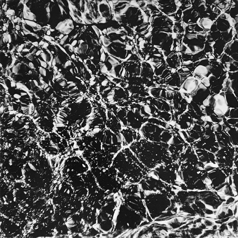 Die schwebenden Eisschollen liegen auf dunklem Wasser wie weiße Pinselstriche auf schwarzem Grund. Besonders eindrucksvoll ist das Spiel von Licht und Schatten, das die scheinbar flachen Strukturen in räumliche Tiefe versetzt. Reflexionen, Glanzlichter und weiche Schatten modellieren die Oberfläche – nicht dokumentarisch, sondern fast skulptural.