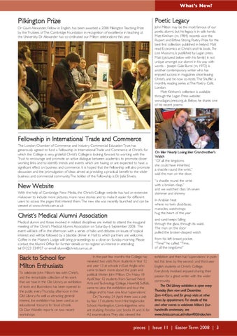 On Her Nearly Losing Her Grandmother’s Watch “Of all the kingdoms she could have inherited, a shackle round the wrist,” said the man on the door, “a shackle round the wrist with a broken clasp,” and we watched class oh-seven shimmer and shimmy in Arabian heat where no twin clockfaces, manacles, watchstraps hug the heart of the year and sand keeps falling through the glass, through its waist. The man on the door pulled the broken-clasped watch from his left breast pocket. “Time!” he called. “Time, of all the kingdoms!” exhibition and then had ‘supervisions’ in pairs led, this time, by the second- and third-year English students at Christ’s College. Everybody involved enjoyed sharing their passion for a great writer with the wider community. The Old Library exhibition is open every Thursday from now until December, 2pm-4.45pm, and for group visits at other times by appointment. For details of this and other events to celebrate Milton’s fourhundredth anniversary, see www.christs.cam.ac.uk/milton400/index.htm