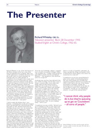 The Presenter Richard Whiteley OBE DL , Television presenter. Born 28 December 1943. Studied English at Christ’s College, 1962-65.