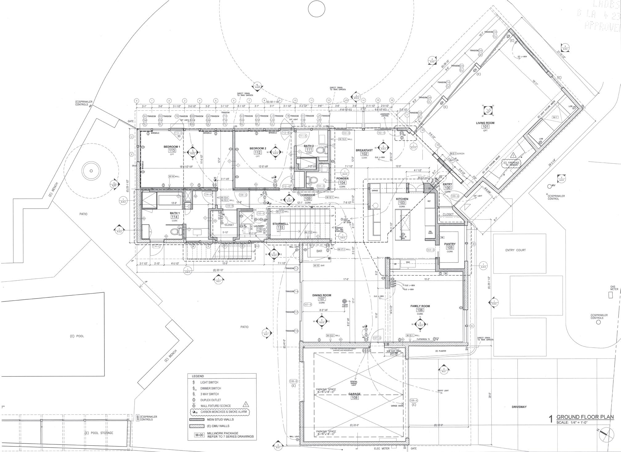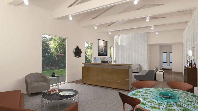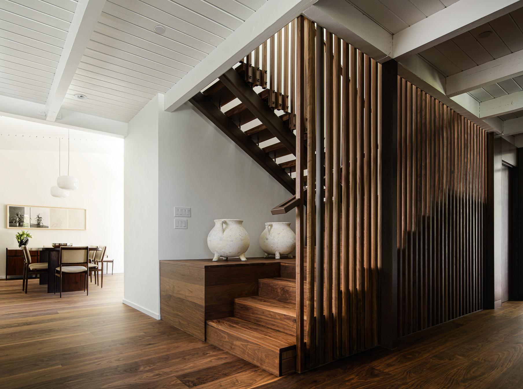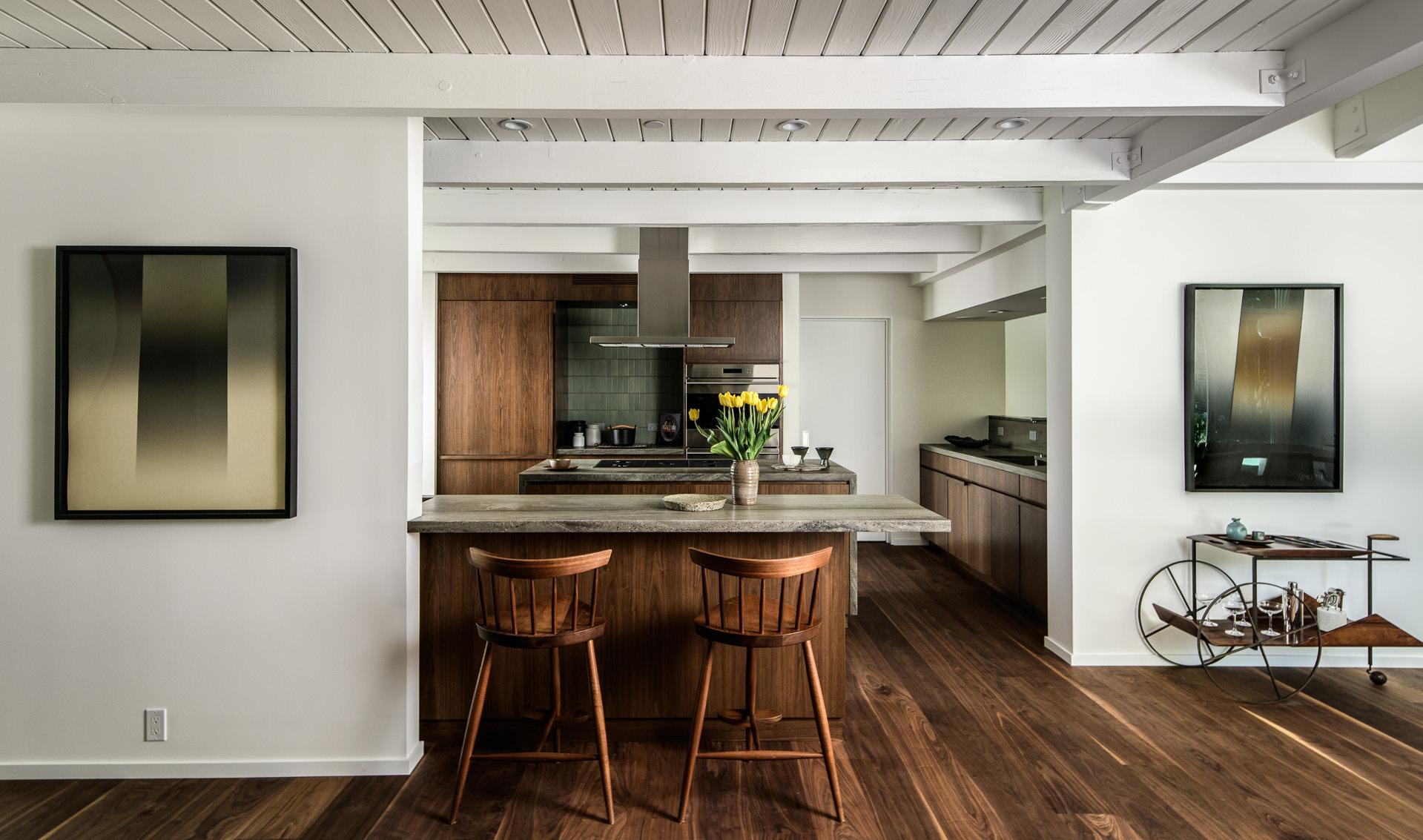 As an early works of Pierre Koenig, originally designed by Kenneth Lind, Chu-Gooding Architects were sought out to renovate and expand the existing one-story house, along with integrating the sprawling, mature landscape. We played upon the accordion-fold glass wall to allow for the picturesque courtyard experience; using the material palette as an ode to the stunning landscape, pairing the dark walnut and grey-green quartzite with the large eucalyptus tree just beyond the glass wall. Instead of challenging the previous work of a recognized architect, it was more compelling to focus on how transitional space can be used to spark a meaningful dialogue between the existing and new. With my realistic renderings, color and material selections, as well as detailed CD drawings, we created a series of transitional elements that bring a unique harmonization between the act of renovation and historic preservation.