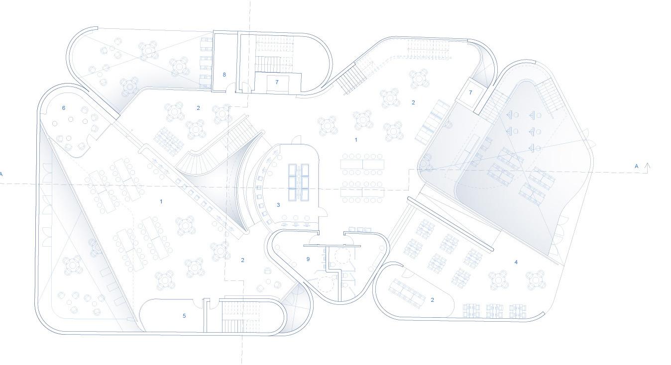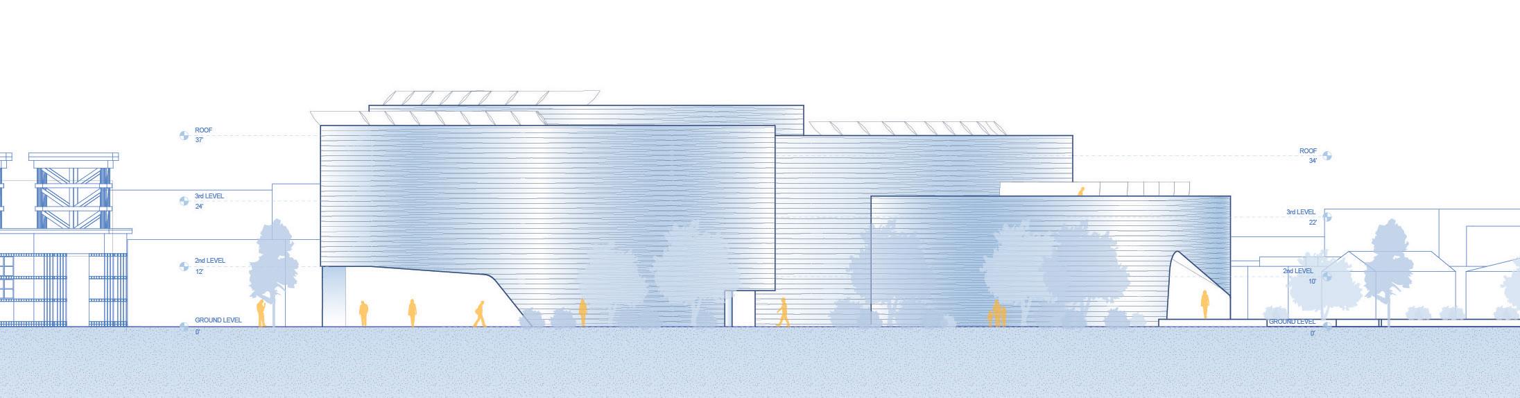 The New Venice Library for Art & Technology becomes a space for both communities to express their interests, practice their skills, and research their professions while influencing each other’s work. Curated around art and technology, this library is a space for locals and visitors alike. The library contains stacks, workshops space, computer rooms, galleries, and an auditorium amongst other program. The form of the building uses the grid system of the neighboring existing library; filleting the corners to soften the complexities of the major street intersections. The double and triple height spaces and light wells encourage the visitors to observe and inspire the work of the visiting artists and tech enthusiasts from the different levels.