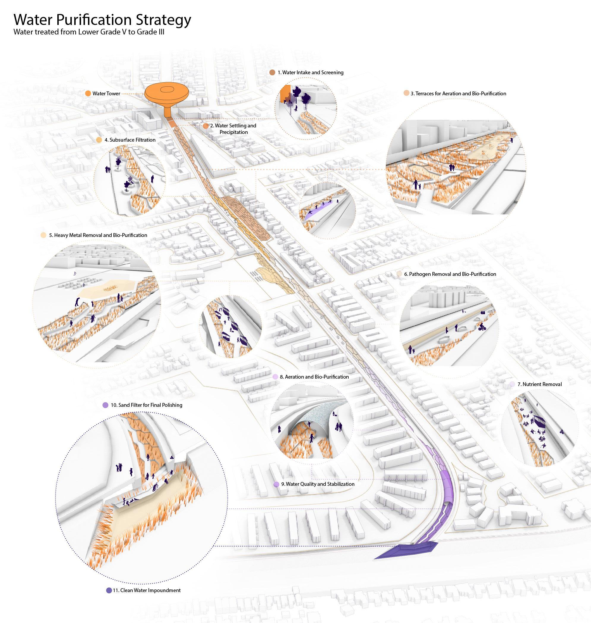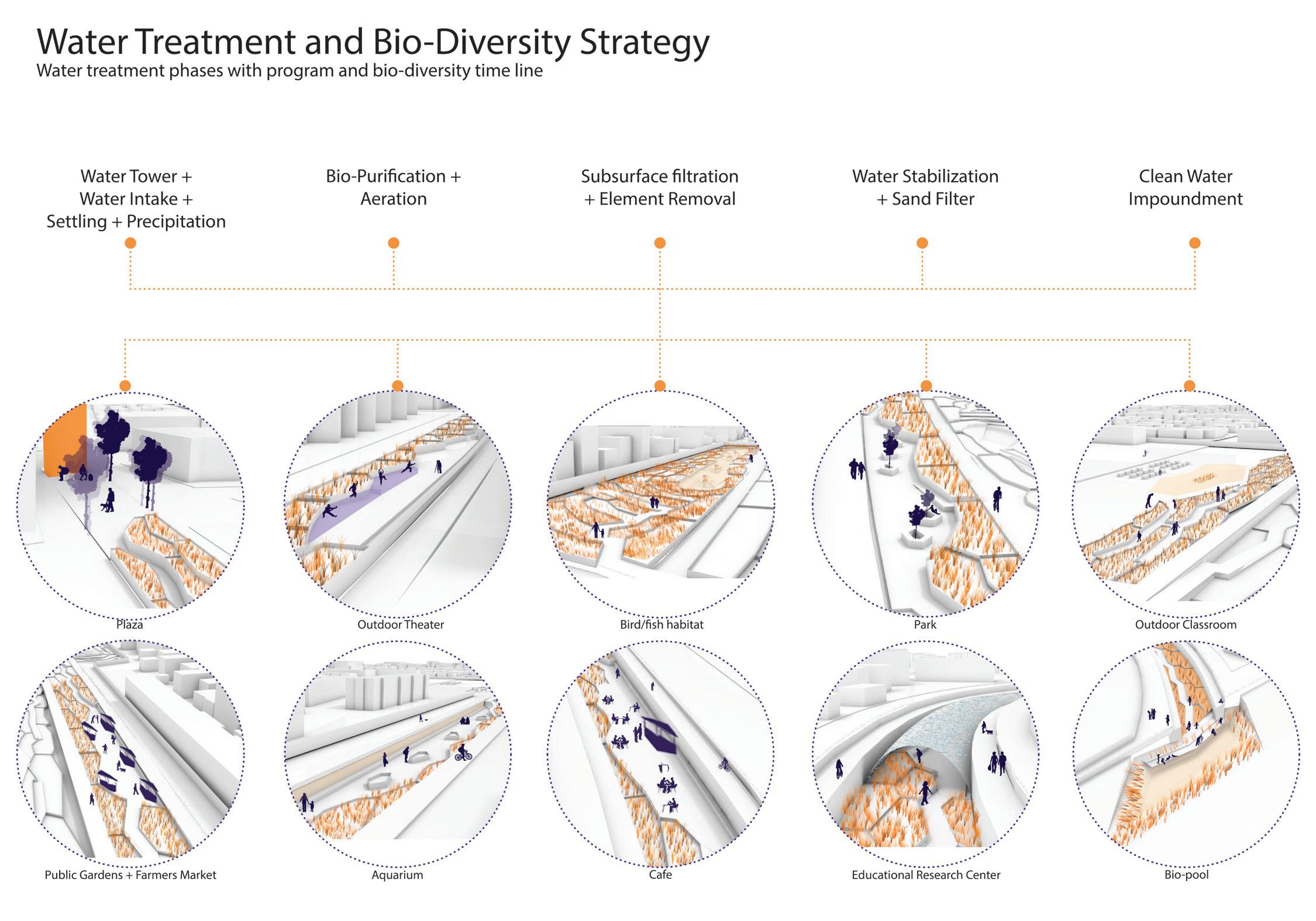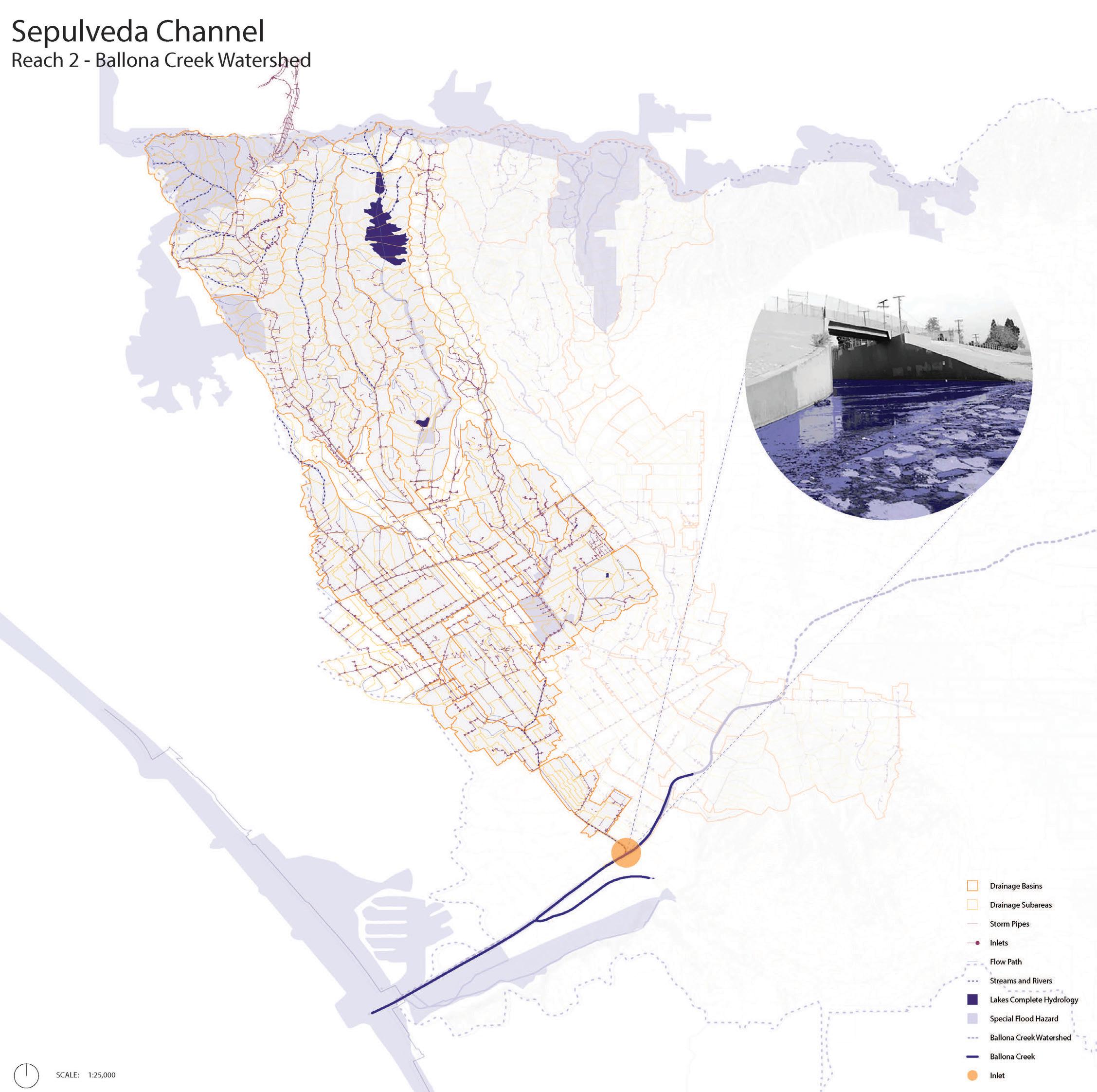 The Ballona Creek Watershed covers nearly 130 square miles of the Los Angeles Basin, capturing water that is sent through the stormwater system, drained into the creek, and eventually channeled into the Santa Monica Bay untreated. This creates health concerns for the local neighborhoods along the Ballona Creek, pollutes the Pacific Ocean, and harms the native ecologies in and around the channel. My proposal is a water-purification strategy implemented in the mile-long open portion of the Sepulveda sub-basin channel, the largest area covered through a single inlet within the Ballona Creek Watershed. Public facilities are integrated into this pathway of wetlands to bring in community consciousness of the natural environment and promote sustainability. This proposal increases biodiversity, creates community awareness of their environment, and reinvents a vital piece of urban infrastructure. Connecting these spaces is 11 stages of water purification that are divided into three phases: aeration/transition zones, phytoremediation, and constructed wetlands.