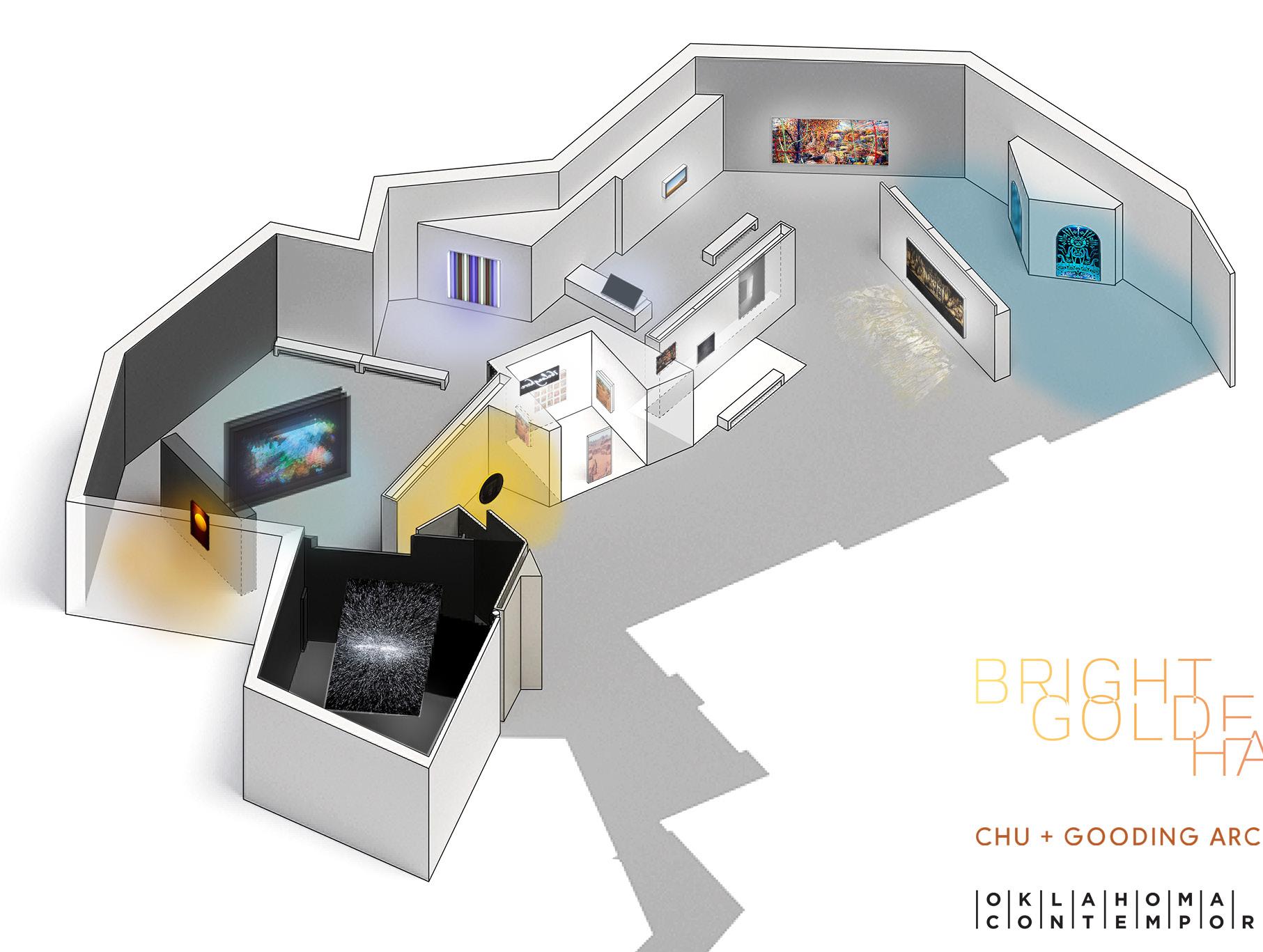 This project revolves heavily on light, both physical and conceptual, with each artwork emphasizing light to create place and identity that demanded individual and careful treatment of their experiential moment. Thus, creating a cohesive journey through and from one to the next was crucial to the overall viewing experience. The bare gallery space of the Oklahoma Contemporary Art Center is shaped by fifteen faceted walls, which created a specific set of spacial parameters that created unique design challenges.