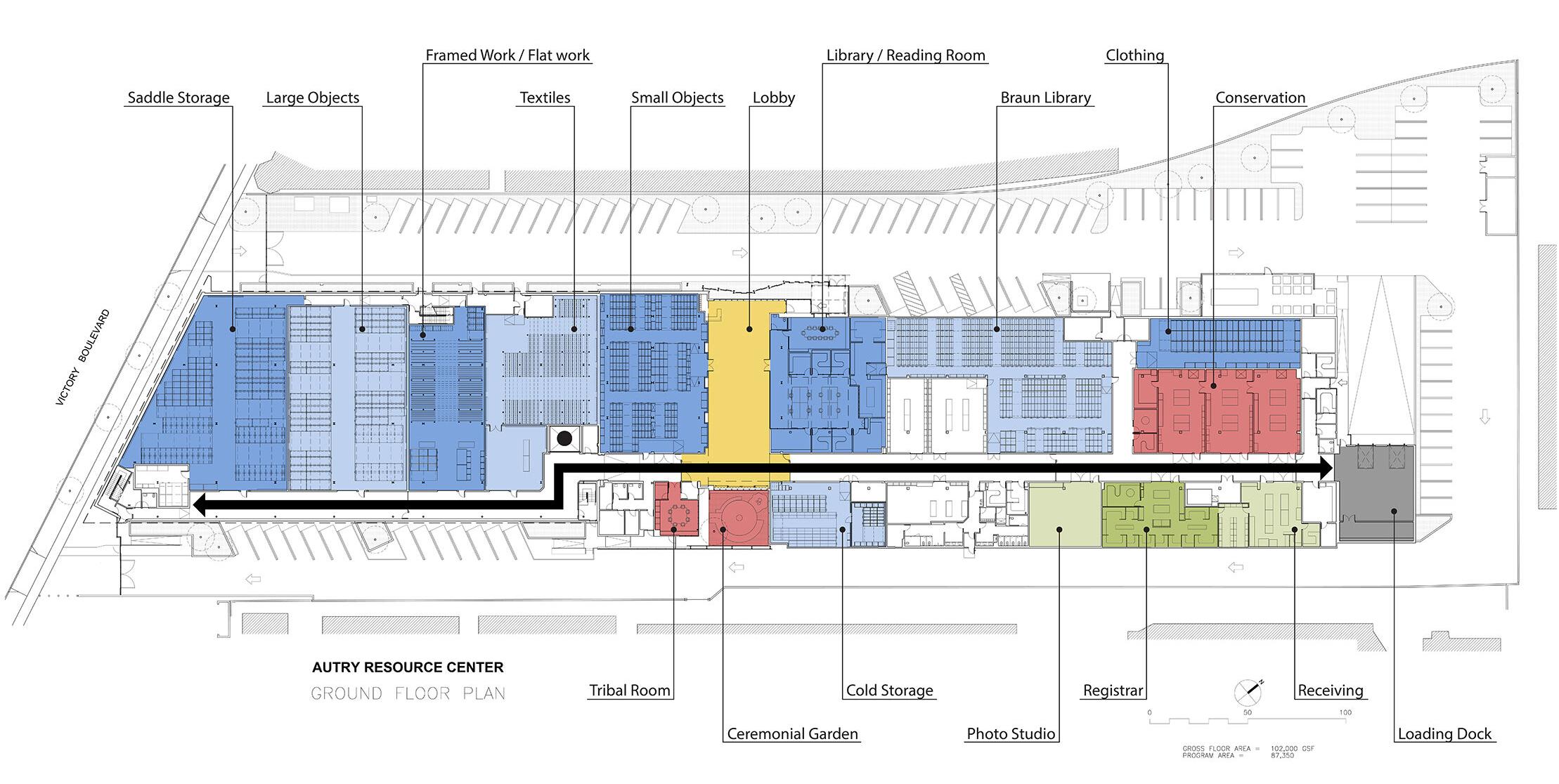 The Autry Resource Center is home to the second largest collection of Native American artifacts in the United States, owned by the Autry Museum of the American West. Four existing, uninhabitable buildings were adapted to accommodate collections storage and research institution to preserve Native American history.