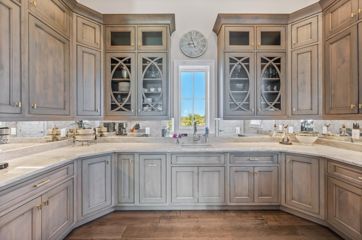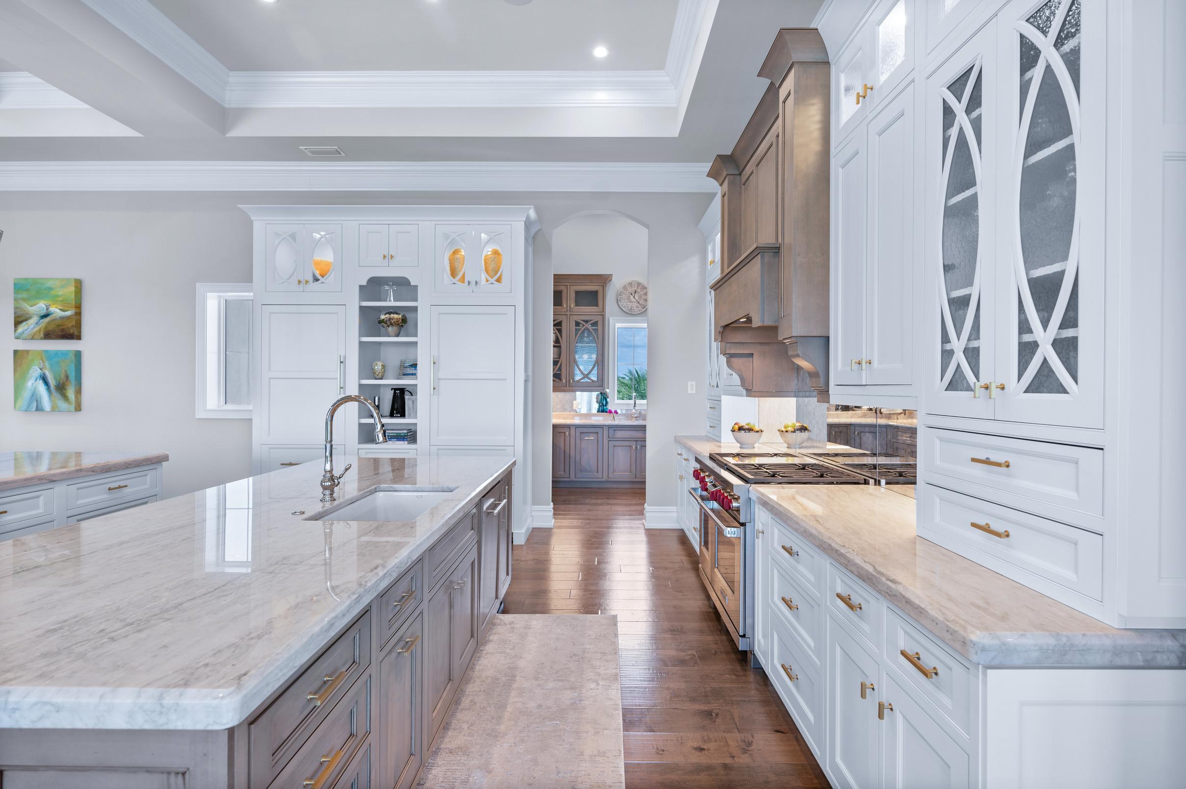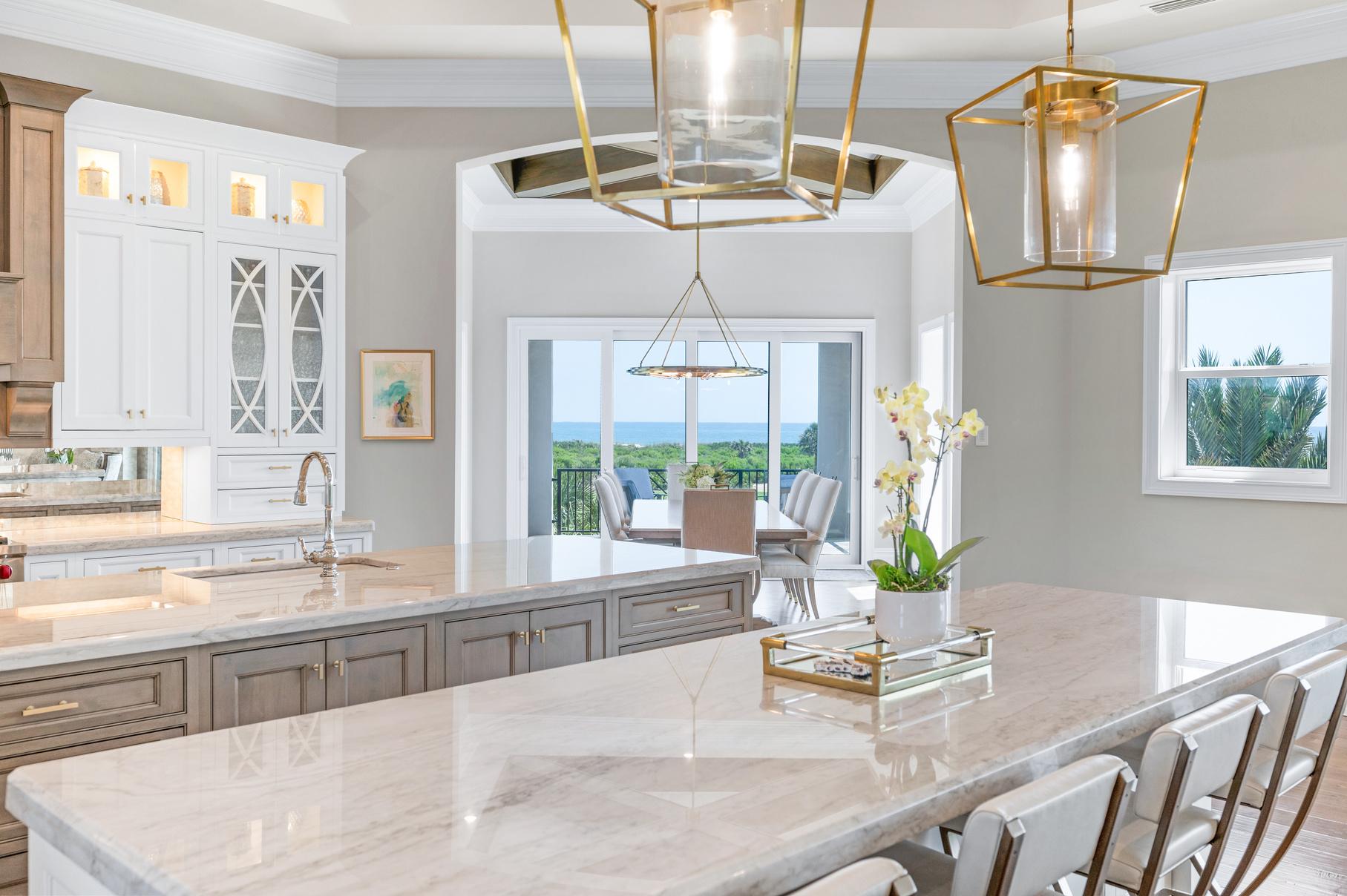 Discover a chef’s paradise, where a well-appointed scullery offers ample storage and a sink with a Tyent ionized water faucet. Just off the kitchen, the al fresco dining area reveals breathtaking sunrise views, perfect for serene morning meals. The kitchen itself is a masterpiece, featuring two Sub-Zero refrigerators and a double island for abundant meal preparation and entertaining space. Every detail, from the spacious layout to the high-end appliances, is designed to enhance your culinary experience.