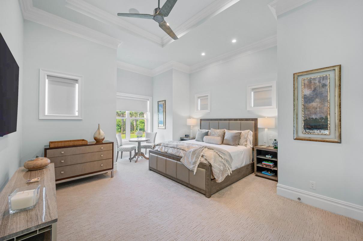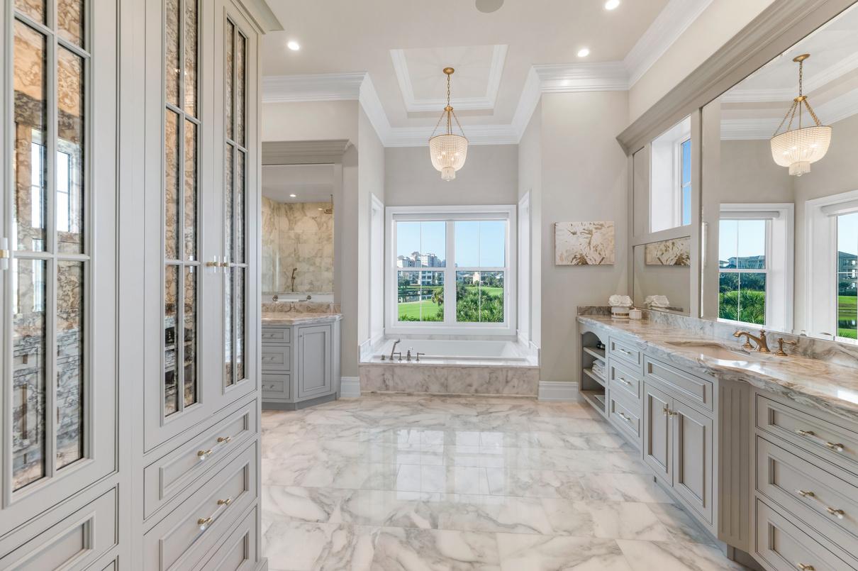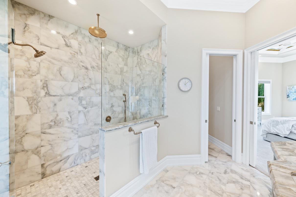 As you enter the elegant owner’s retreat, you're enveloped in an atmosphere of relaxation and luxury. This sanctuary, designed with meticulous attention to detail, features custom marble and tile on every surface, creating a sophisticated and timeless aesthetic. Each window frames breathtaking ocean views, providing a serene backdrop that soothes the soul. The spacious his and hers closets offer ample storage and impeccable organization, ensuring a clutter-free environment. Here, every element harmonizes to create a perfect blend of comfort and opulence.