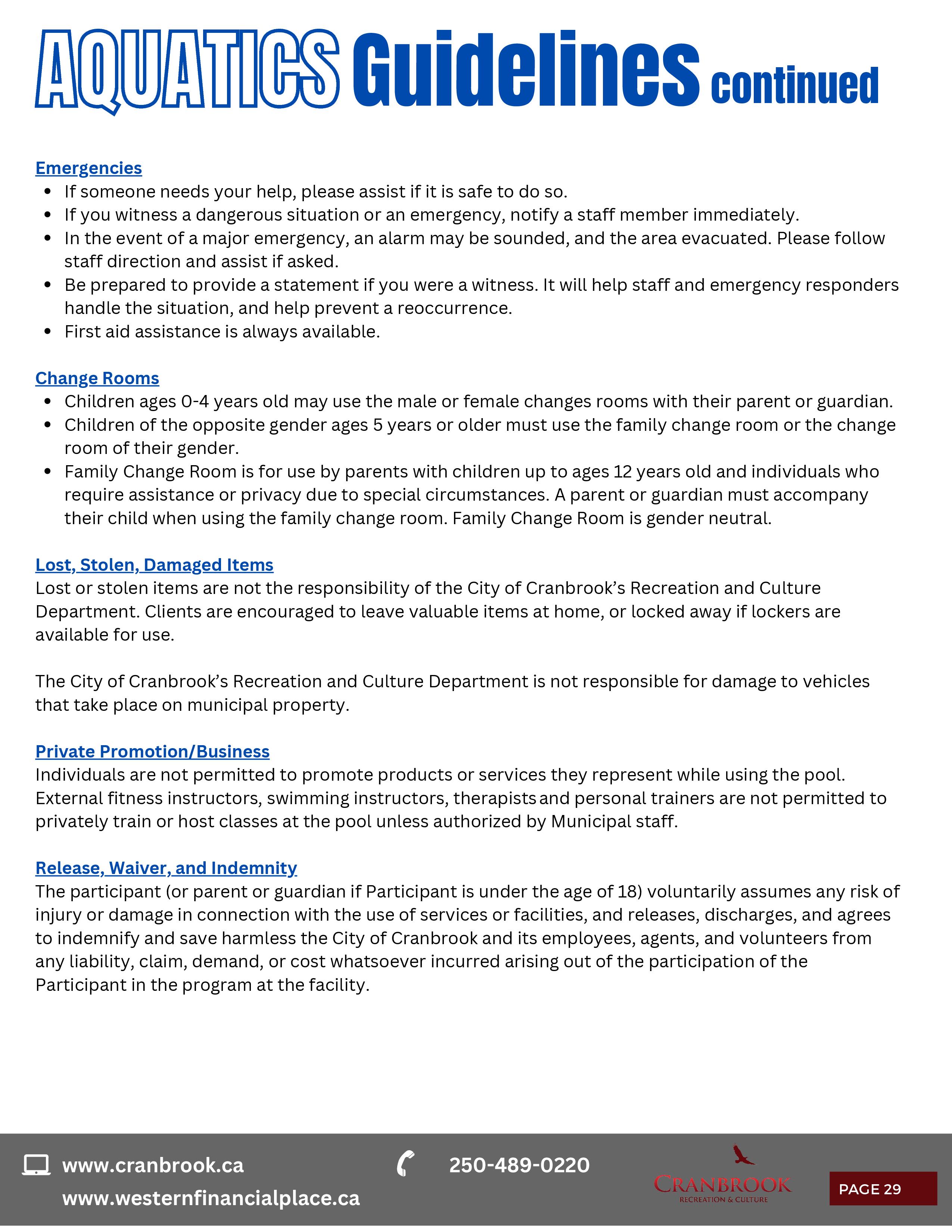 The participant (or parent or guardian if Participant is undertheageof 18) voluntarily assumes anyriskof injury or damage in connection with the use of services or facilities, and releases, discharges, andagrees to indemnify and save harmless the City of Cranbrook and its employees, agents, and volunteers from any liability, claim, demand, or cost whatsoever incurred arising out of the participation of the Participant in the program at the facility.