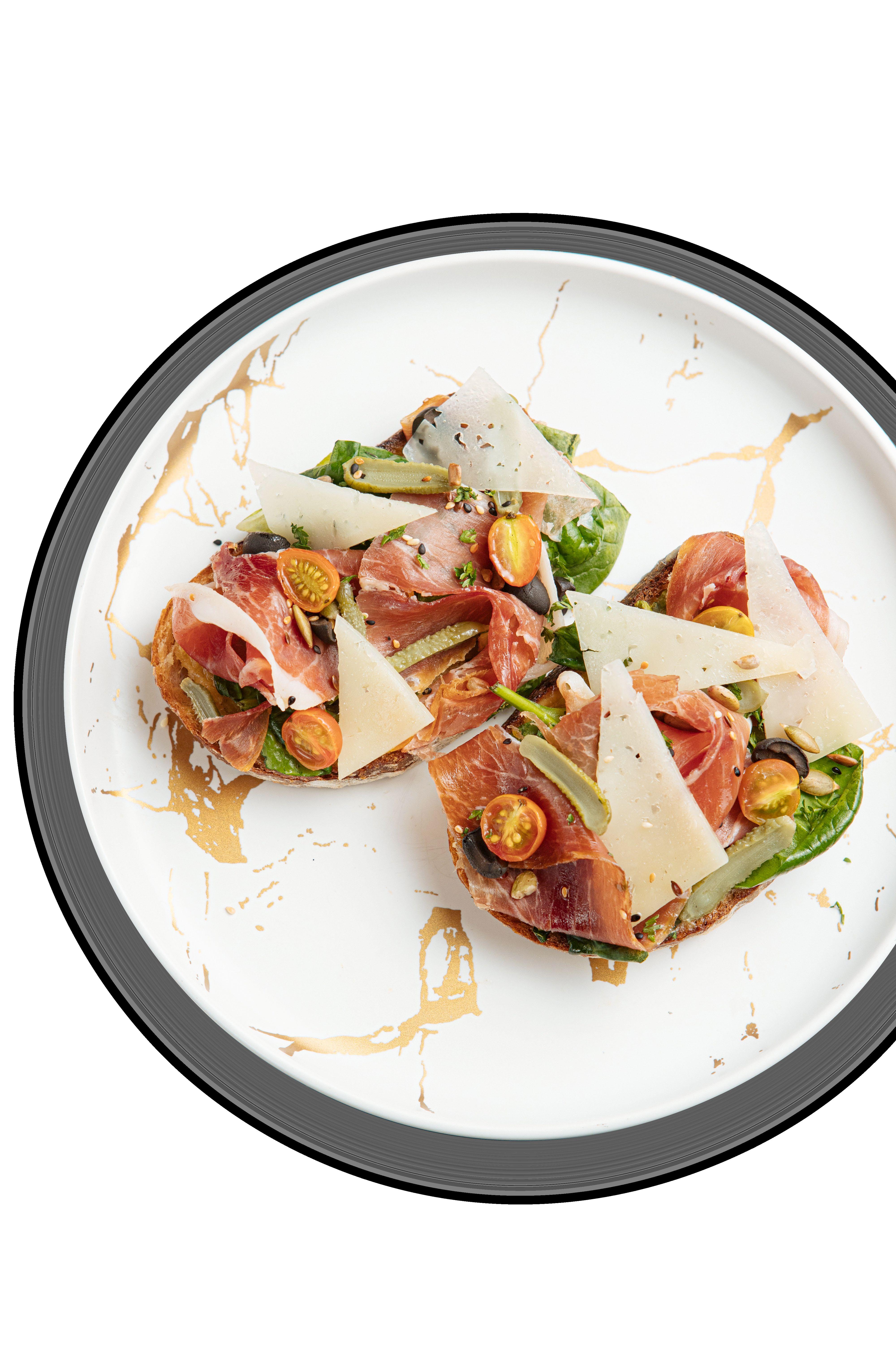 Open-faced sourdough sandwich topped with avocado, caper berries, lemon segment, baby spinach, and goats cheese, served with salads