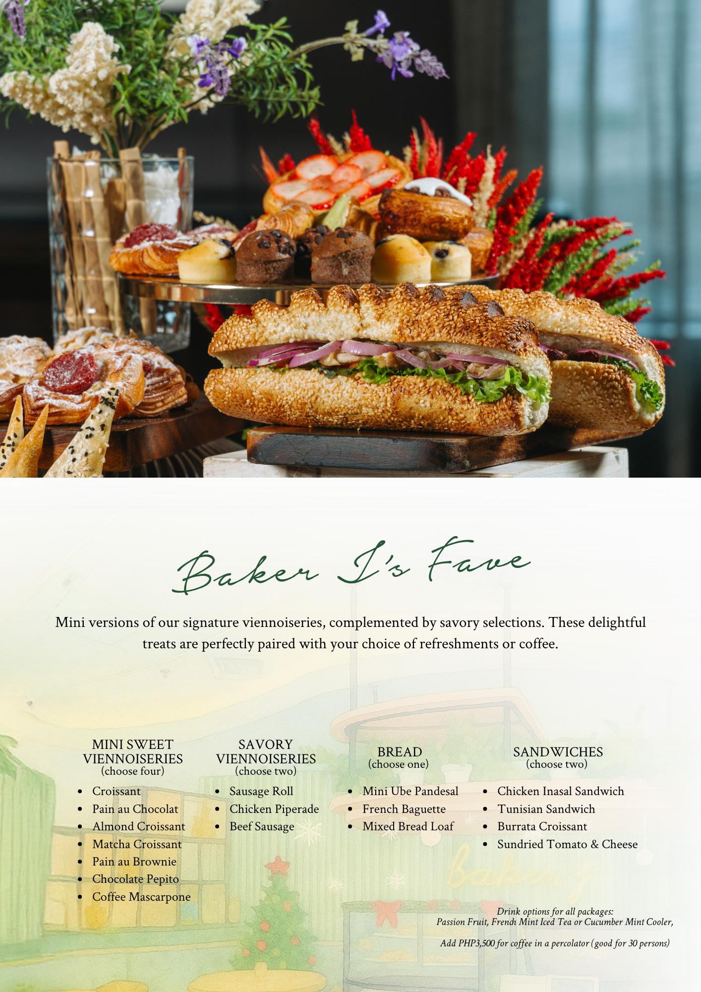 Savor the joy of Christmas with the medley of Baker J’s handcrafted croissants made to warm hearts and delight every table. Enjoy the cozy sweetness of the Hazelnut Twirl , the silky comfort of the fruity charm of the Strawberry Basket Croissant the savory goodness of Pain au Sausage, Le Quiche, Sausage Croissant — each one baked to flaky perfection and filled with festive cheer.