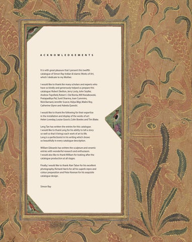 It is with great pleasure that I present this twelfth catalogue of Simon Ray Indian & Islamic Works of Art, which I dedicate to my Mother. I would like to thank the many scholars and experts who have so kindly and generously helped us prepare this catalogue: Robert Skelton, Jerry Losty, John Seyller, Andrew Topsfield, Robert J. Del Bonta, Will Kwiatkowski, Pratapaditya Pal, Sunil Sharma, Joan Cummins, Nick Barnard, Jennifer Scarce, H端lya Bilgi, Malini Roy, Catherine Glynn and Adeela Qureshi. I would like to thank the following for their expertise in the installation and display of the works of art: Helen Loveday, Louise Gooch, Colin Bowles and Tim Blake. Leng Tan has written the entries for this catalogue. I would like to thank Leng for his ability to tell a story so well so that it brings each work of art to life. Leng is a perfectionist in his writing which shows so beautifully in every catalogue description. William Edwards has written the sculpture and ceramic entries with wonderful research and enthusiasm. I would also like to thank William for looking after the catalogue production at all stages. Finally, I would like to thank Alan Tabor for his excellent photography, Richard Harris for all his superb repro and colour preparation and Peter Keenan for his exquisite catalogue design.