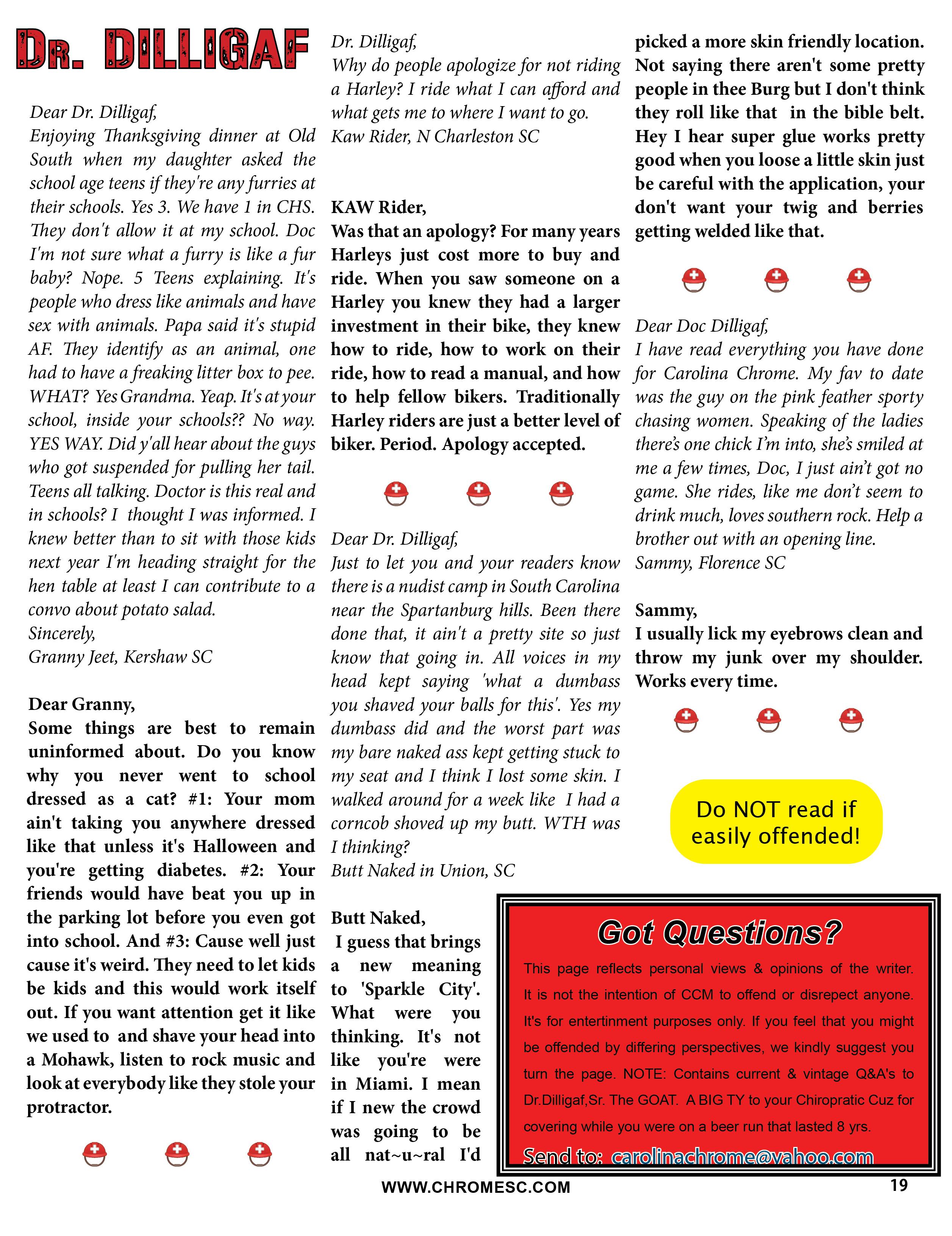 This page reflects personal views & opinions of the writer. It is not the intention of CCM to offend or disrepect anyone. It's for entertinment purposes only. If you feel that you might be offended by differing perspectives, we kindly suggest you turn the page. NOTE: Contains current & vintage Q&A's to Dr.Dilligaf,Sr. The GOAT. A BIG TY to your Chiropratic Cuz for covering while you were on a beer run that lasted 8 yrs. Send to: carolinachrome@yahoo.com