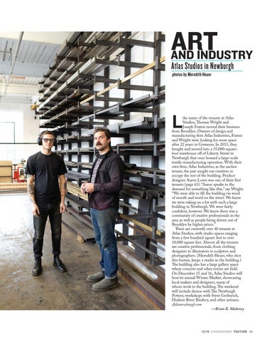 ike many of the tenants at Atlas Studios, Thomas Wright and Joseph Fratesi moved their business from Brooklyn. Owners of design and manufacturing firm Atlas Industries, Fratesi and Wright were looking for more space after 22 years in Gowanus. In 2013, they bought and moved into a 55,000-squarefoot warehouse off of Liberty Street in Newburgh that once housed a large-scale textile manufacturing operation. With their own firm, Atlas Industries, as the anchor tenant, the pair sought out creatives to occupy the rest of the building. Product designer Aaron Lown was one of their first tenants (page 63). “Aaron speaks to the demand for something like this,” say Wright. “We were able to fill the building via word of mouth and word on the street. We knew we were taking on a lot with such a large building in Newburgh. We were fairly confident, however. We knew there was a community of creative professionals in the area as well as people being driven out of Brooklyn by higher prices.” There are currently over 40 tenants at Atlas Studios, with studio spaces ranging from a few hundred square feet to over 10,000 square feet. Almost all the tenants are creative professionals, from clothing designers to illustrators to sculptors and photographers. (Meredith Heuer, who shot this feature, keeps a studio in the building.) The building also has a large gallery space where concerts and other events are held. On December 15 and 16, Atlas Studios will host its annual Winter Market, showcasing local makers and designers, many of whom work in the building. The weekend will include demos with The Newburgh Pottery, workshops with Steve Gerberich, Hudson River Bindery, and other artisans. Atlasnewburgh.com —Brian K. Mahoney