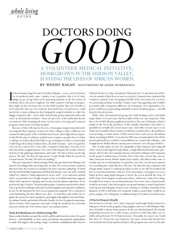 n the mountain-ringed terrain of Gondar, Ethiopia—a once-royal city known for its medieval castle ruins—malaria is not a problem. But a lot of other things can go wrong when you’re practicing medicine in the far reaches of northeast Africa. The power might go out while a patient is having cryosurgery. Rats might eat the electrical wires on the LEEP machine that cost $10,000. A CO2 tank that’s the size of a warhead, borrowed from a local brewery, could just decide to stop working one day, bringing the surgical schedule to a halt. For Maggie Carpenter, MD—a New Paltz–based family-practice physician with a side career in international medicine—those are just a few of the snafus that she has encountered while launching the first cervical cancer screening and treatment program at University of Gondar Hospital. But none of that will stop Go Doc Go, a homespun, nongovernmental medical nonprofit that Carpenter created out of her calling to make a difference for women’s health in parts of the world that need it most. Since high school, Carpenter has felt the urge to volunteer and find ways to improve people’s lives. So when a colleague in Seattle asked if she’d like to go to Ethiopia to broker a contract that would bring US medical residents there, she didn’t hesitate—and even paid her own way for a visit in 2011. Once there, Carpenter found there was more to be done beyond her original mission. “On a tour of the hospital,” she recalls, “a doctor took me to the pathology department, and I said, ‘Oh, this is where you do Pap smears.’ He said, ‘We don’t do Pap smears.’ I said, ‘Really? What do you do for cervical cancer?’ He said, ‘We don’t do anything.’” That got Carpenter’s wheels turning: When she got back from Ethiopia, she started researching what was being done in other low socioeconomic countries that don’t have the resources or facilities for more extensive pathology. “I found that the World Health Organization [WHO] had already come out with a method called VIA, which is “visual inspection by acetic acid”—a see-and-treat method where you put basic store-bought vinegar on the cervix [abnormal tissue appears white when exposed to vinegar], and you just treat the patient right there. It’s as good as the Pap, or better.” An action plan in place, Carpenter just needed to find a way to get back to Ethiopia with some medical supplies and expensive machinery in tow. So she launched Go Doc Go as a grassroots nonprofit 501c3, and got to work fundraising. The first efforts were slow—it took three and a half years to gather the money for travel, machinery, and supplies through her network of family, alumni, friends, and friends of friends. Finally, Go Doc Go gained momentum, and in October 2014 Carpenter was ready to help the medieval city of Gondar step more firmly into 21st-century cancer care and prevention. Trials & Tribulations of a Globetrotting MD Many medical facilities around the world could benefit from the work of do-good doctors—and thankfully, we have some powerhouse international organizations to make that happen. But joining a large, worldwide establishment like Doctors 74 WHOLE LIVING CHRONOGRAM 2/16