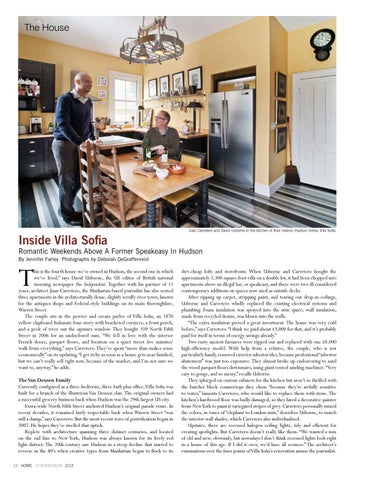 his is the fourth house we’ve owned in Hudson, the second one in which we’ve lived,” says David Usborne, the US editor of British national morning newspaper the Independent. Together with his partner of 11 years, architect Juan Carretero, the Manhattan-based journalist has also rented three apartments in the architecturally dense, slightly scruffy river town, known for the antiques shops and Federal-style buildings on its main thoroughfare, Warren Street. The couple sits in the pewter and cream parlor of Villa Sofia, an 1870 yellow clapboard Italianate four-story with bracketed cornices, a front porch, and a peek of river out the upstairs window. They bought 109 North Fifth Street in 2006 for an undisclosed sum. “We fell in love with the interior French doors, parquet floors, and location on a quiet street five minutes’ walk from everything,” says Carretero. They’ve spent “more than makes sense economically” on its updating. “I get itchy as soon as a house gets near finished, but we can’t really sell right now, because of the market, and I’m not sure we want to, anyway,” he adds. The Van Deusen Family Currently configured as a three-bedroom, three-bath plus office, Villa Sofia was built for a branch of the illustrious Van Deusen clan. The original owners had a successful grocery business back when Hudson was the 29th-largest US city. Extra-wide North Fifth Street anchored Hudson’s original parade route. In recent decades, it remained fairly respectable back when Warren Street “was still a dump,” says Carretero. But the most recent wave of gentrification began in 2007. He hopes they’ve swelled that uptick. Replete with architecture spanning three distinct centuries, and located on the rail line to New York, Hudson was always known for its lively red light district. The 20th century saw Hudson in a steep decline that started to reverse in the 80’s when creative types from Manhattan began to flock to its 24 home ChronograM 2/13