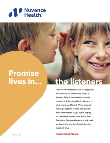 the listeners The ones who really listen. Ear to the ground, full attention, no distractions, tuned in... listeners. They understand what’s really important. At Nuvance Health, listening is what makes us different. We go beyond hearing what’s the matter, and actually hear what matters to you. We’re helping you feel heard the first time. All the time. Every time. Because when you speak, and we listen… the promise of understanding lives in all of us.