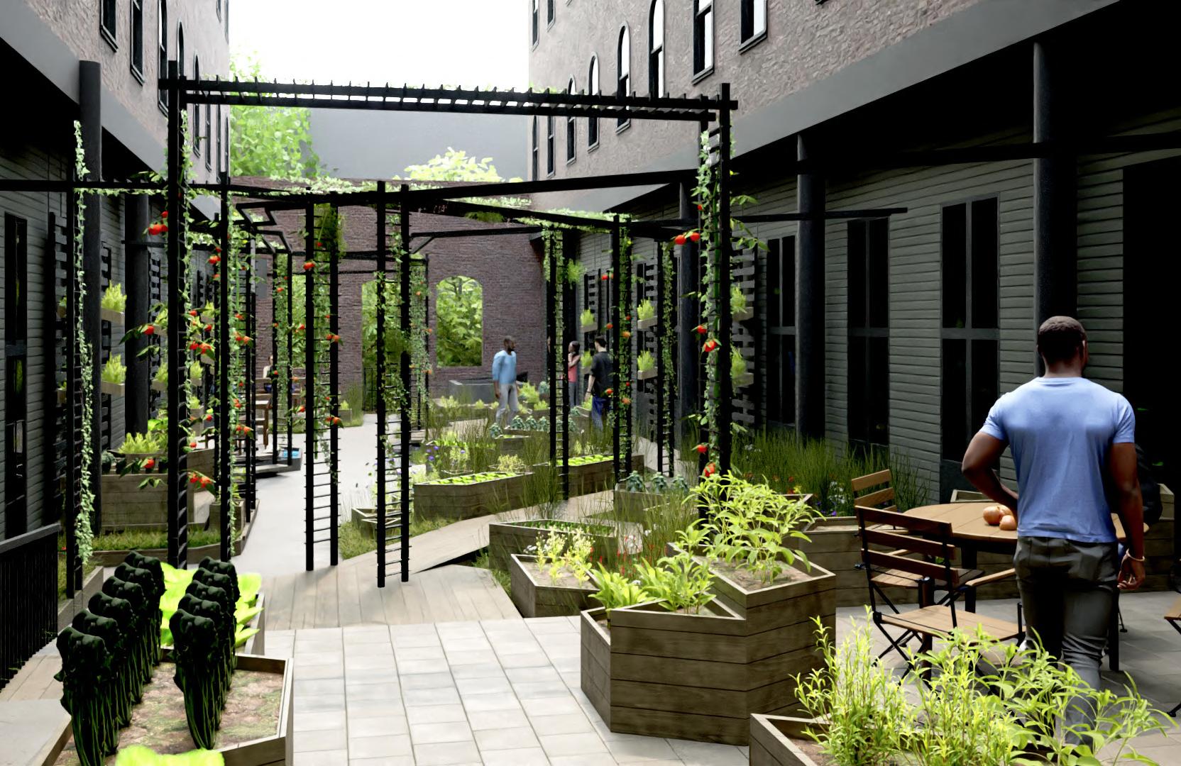 Farmer Jawn’s mission to bring locally sourced, organic produce to Kensington includes a commercial space and a courtyard garden. This courtyard garden, situated in the Jasper House, doubles as a space that promotes education on urban farming and a place for relaxation and socialization for residents of the Jasper House.