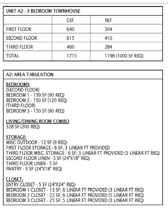 LIHTC SET: TOWNHOUSE A2 - AREA TABULATION, FLOOR PLANS