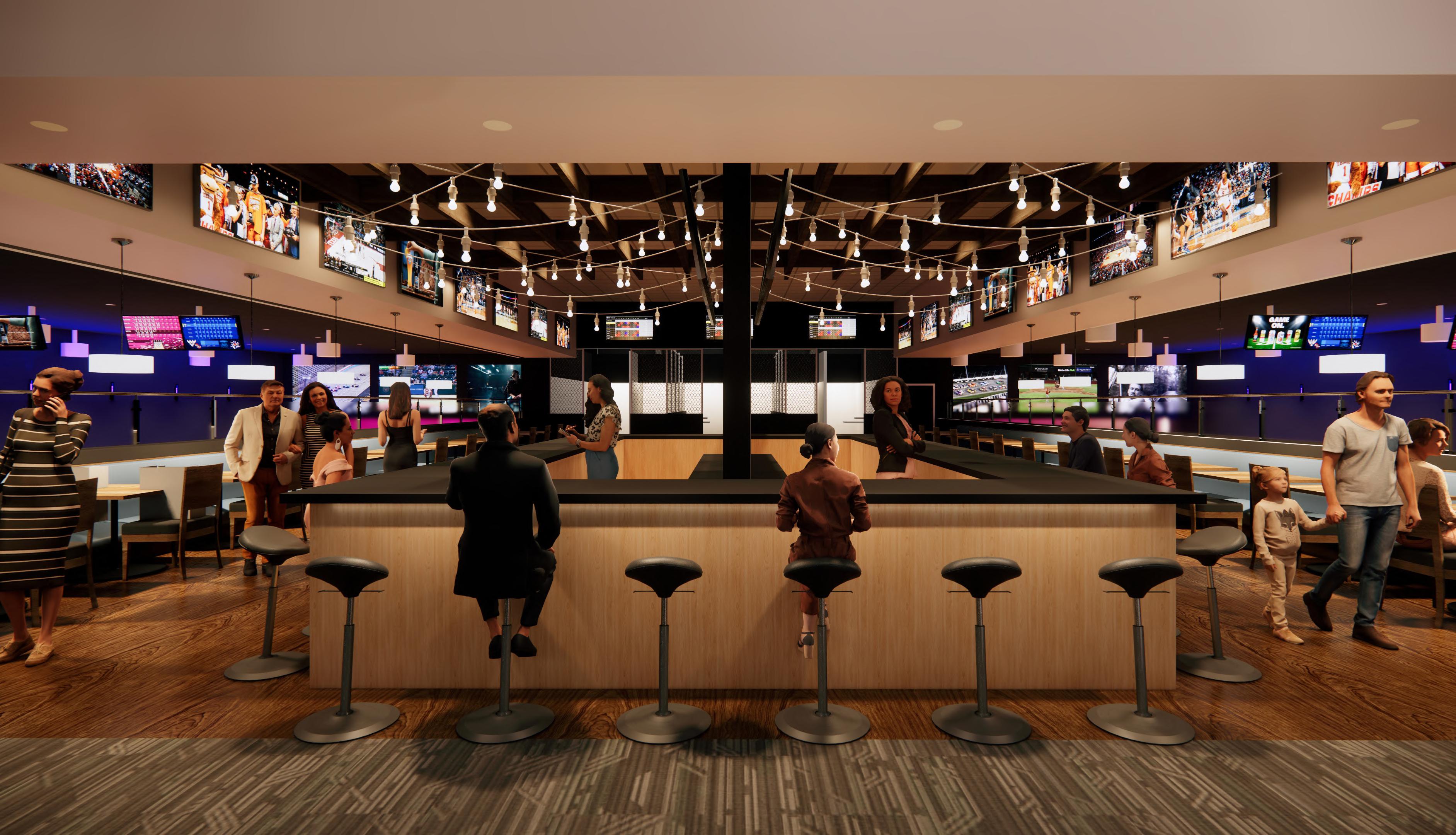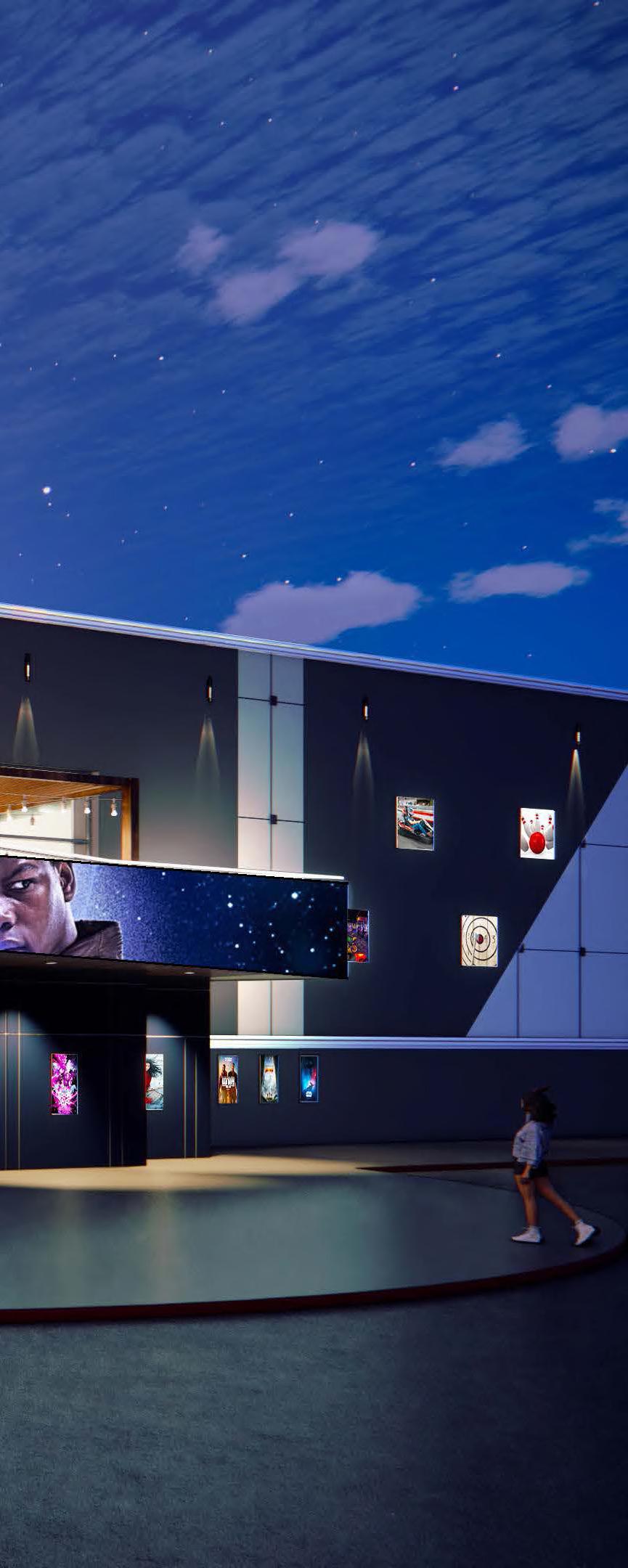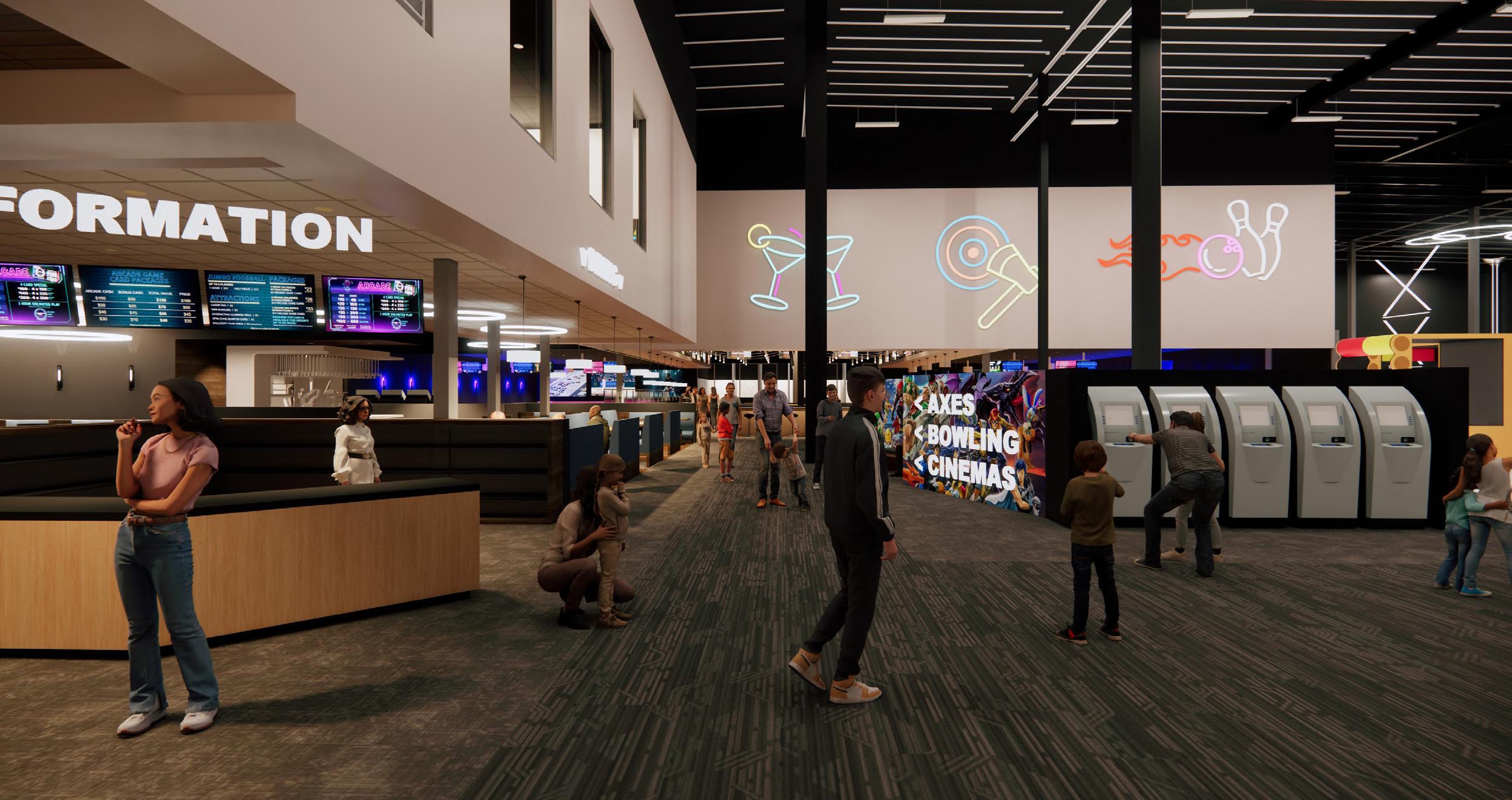 90,000 sf family entertainment center with various activities, theaters, and gathering spaces for private events