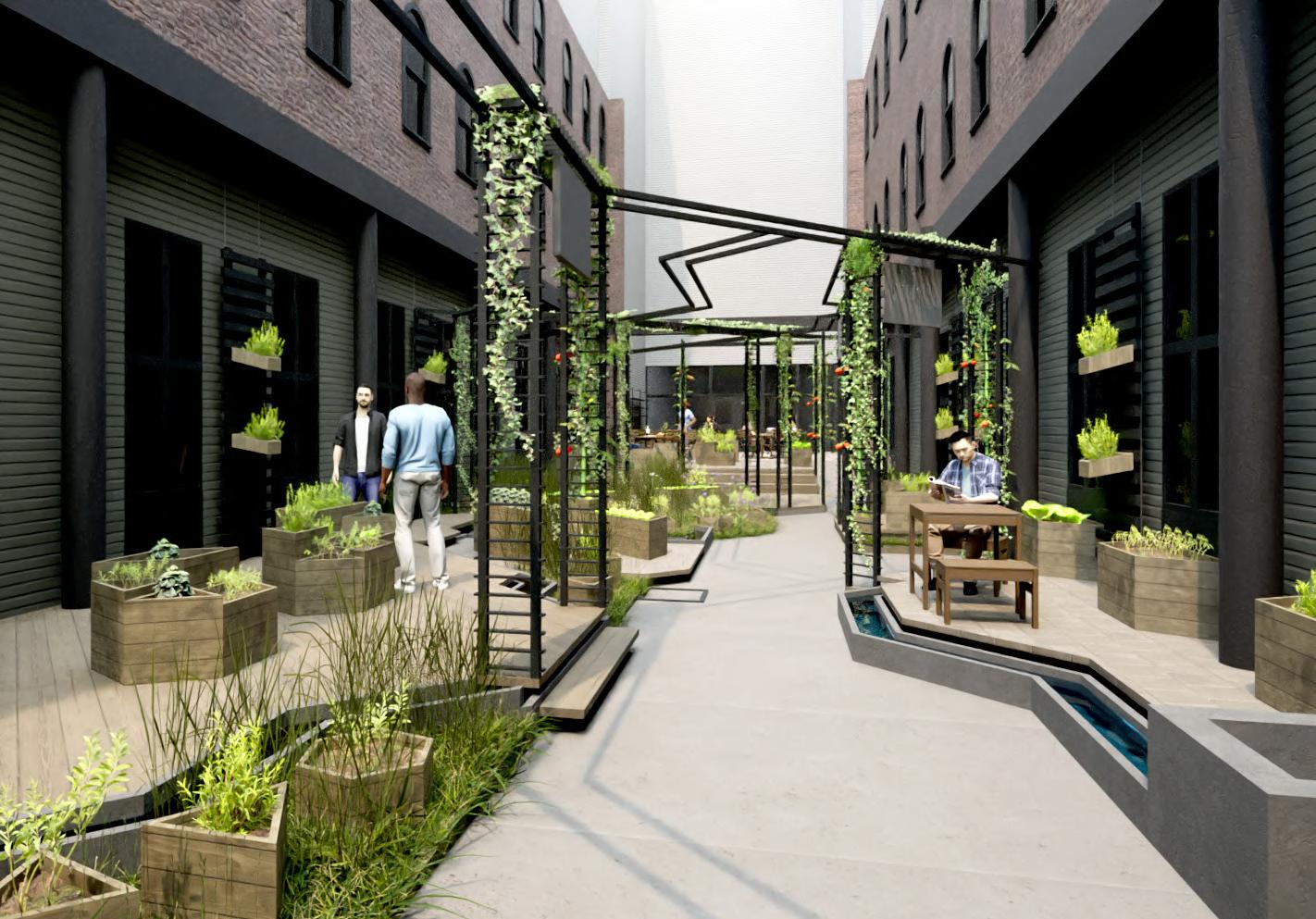 FJ’s Urban Learning Garden focuses on FJ’s vision to have this courtyard be an educational space by incorporating elevated pockets of learning, similar to how grocery stores organize produce and other goods by section. Each platform displays different gardening methods and produce, promoting the importance and uniqueness of urban farming in an attractive way for students.