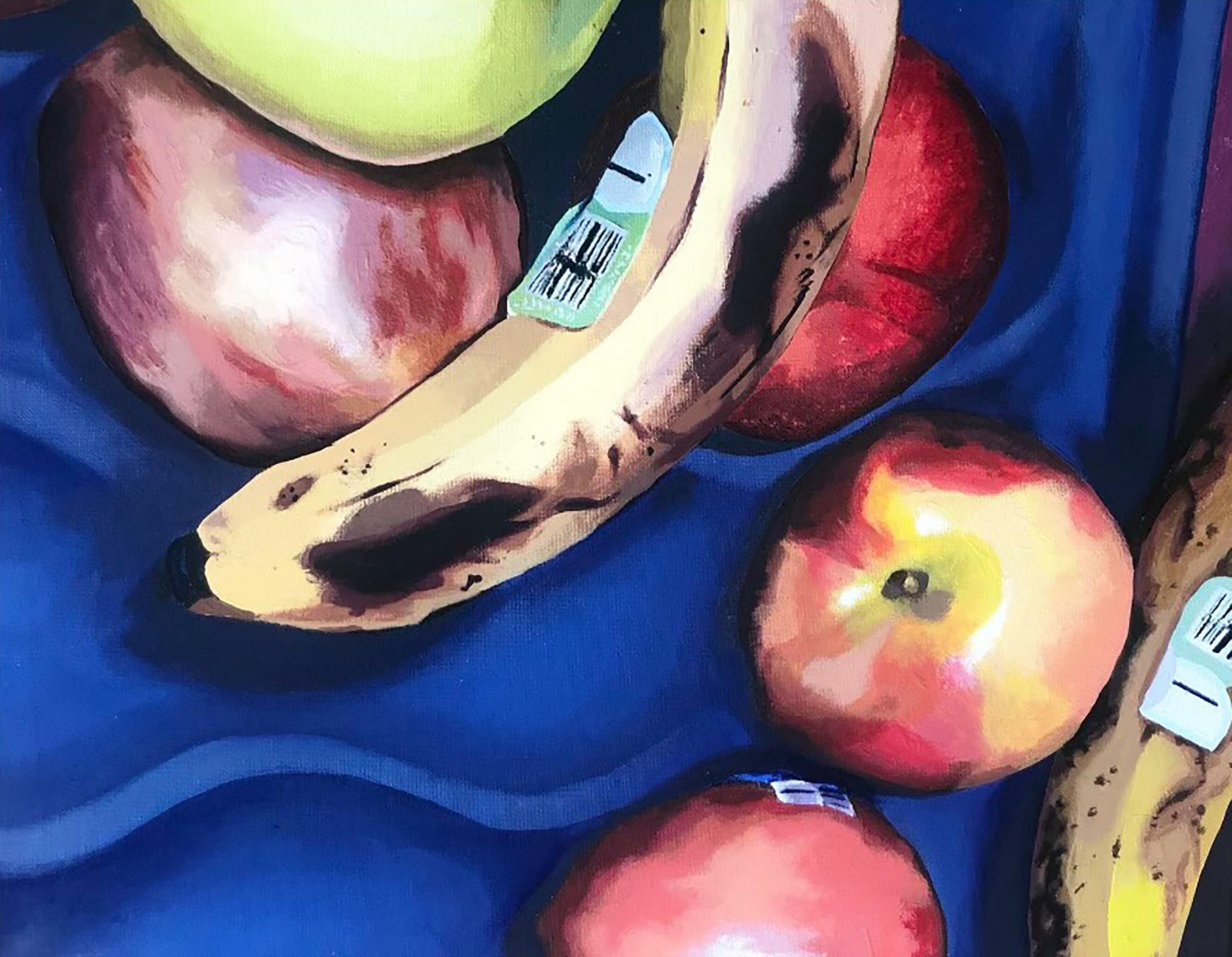 She titled the piece “Satisfaction” for two reasons: she wasn’t going to give up on it until she was satisfied, and the subject was seen as unsatisfactory. While others may have seen no value in the fruits, Kacvinsky saw an opportunity to make something beautiful. Kacvinsky spent more time on the piece than she usually does, and did her best to make sure she was not disappointed with the end result. Creating “Satisfaction” taught her about perseverance and stepping out of her comfort zone.