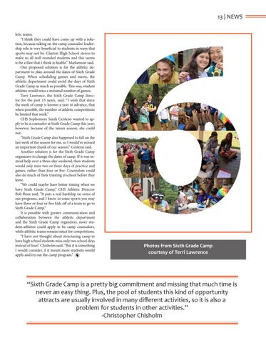 13 | NEWS letic teams. “I think they could have come up with a solution, because taking on the camp counselor leadership role is very beneficial to students in ways that sports may not be. Clayton High School strives to make us all well rounded students and this seems to be a flaw that I think is fixable,” Markenson said. One proposed solution is for the athletic department to plan around the dates of Sixth Grade Camp. When scheduling games and meets, the athletic department could avoid the days of Sixth Grade Camp as much as possible. This way, student athletes would miss a minimal number of games. Terri Lawrence, the Sixth Grade Camp director for the past 15 years, said, “I wish that since the week of camp is known a year in advance, that when possible, the number of athletic competitions be limited that week.” CHS Sophomore Sarah Centeno wanted to apply to be a counselor at Sixth Grade Camp this year; however, because of the tennis season, she could not. “Sixth Grade Camp also happened to fall on the last week of the season for me, so I would’ve missed an important chunk of our season,” Centeno said. Another solution is for the Sixth Grade Camp organizers to change the dates of camp. If it was instead help over a three-day weekend, then students would only miss two or three days of practice and games, rather than four or five. Counselors could also do much of their training at school before they leave. “We could maybe have better timing when we have Sixth Grade Camp,” CHS Athletic Director Bob Bone said. “It puts a real hardship on some of our programs, and I know in some sports you may have three or four or five kids off of a team to go to Sixth Grade Camp.” It is possible with greater communication and collaboration between the athletic department and the Sixth Grade Camp organizers, more student-athletes could apply to be camp counselors, while athletic teams remain intact for competitions. “I have not thought about structuring camp to have high school students miss only two school days instead of four,” Chisholm said. “But it is something I would consider, if it meant more students would apply and try out the camp program.”
