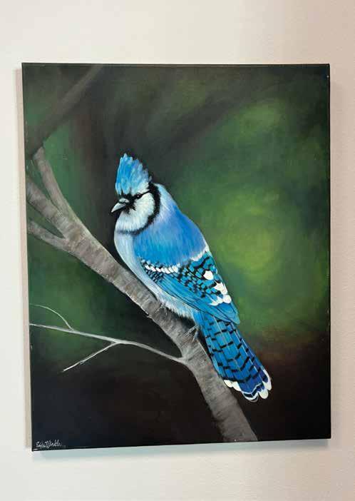 A painting of a blue jay hangs on the wall of a crisis advocacy office at Children’s Home Shelter for Family Safety in Sioux Falls. It’s a beautifullyrendered, finely-detailed and exquisitely simple portrait of a lone bird in the spotlight against a deep green and black background.