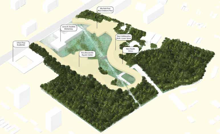 The Ecological Corridor redevelopment of 35th Street aims to provide: safer, comfortable, and enjoyable streets focused on pedestrian traffic; new accessible, engaging, and holistic education typologies; manage and filter groundwater; and create an overall system of care intent on serving Bronzeville residents.