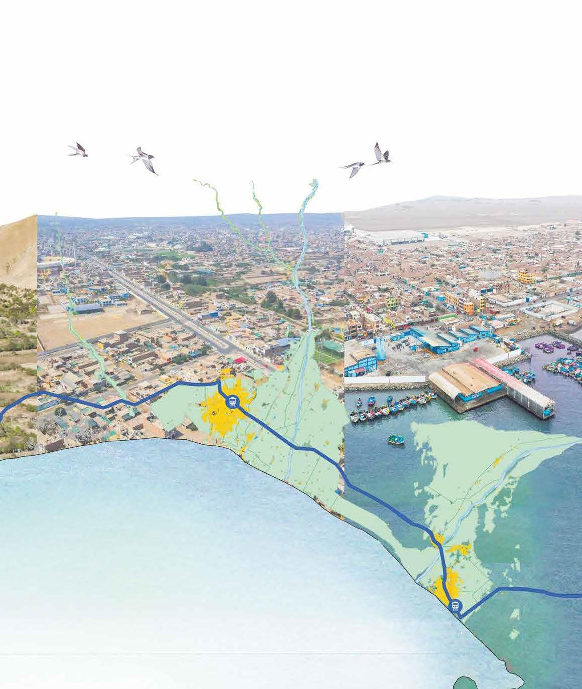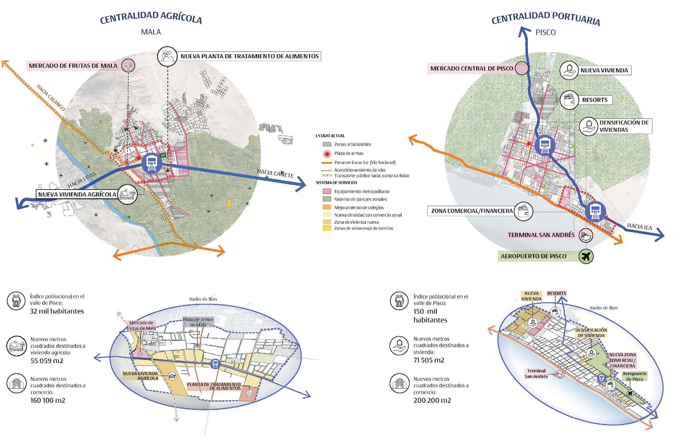 Dado que las ciudades del sur de Lima y el norte de Ica se encuentran dispersas en su población, el proyecto propone unificarlas aprovechando la vía férrea que conecta todas estas. De este modo, se conforma la “ciudad de los 30 minutos” en donde desde el eje central se puede viajar a cualquier parte de esta utilizando un sistema vial férreo. Asimismo, la propuesta también posee un fuerte énfasis en la recuperación de la fauna y flora, de manera que se reduce el espacio para terreno agrícola y se restablece la influencia del corredor verde. Con todo ello, se genera una megaciudad que no necesite a Lima para ser sostenible.