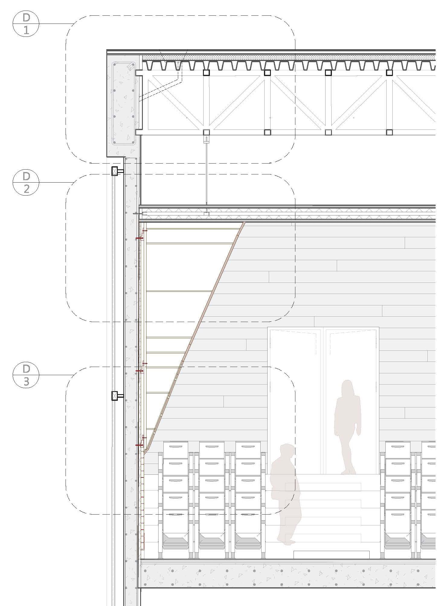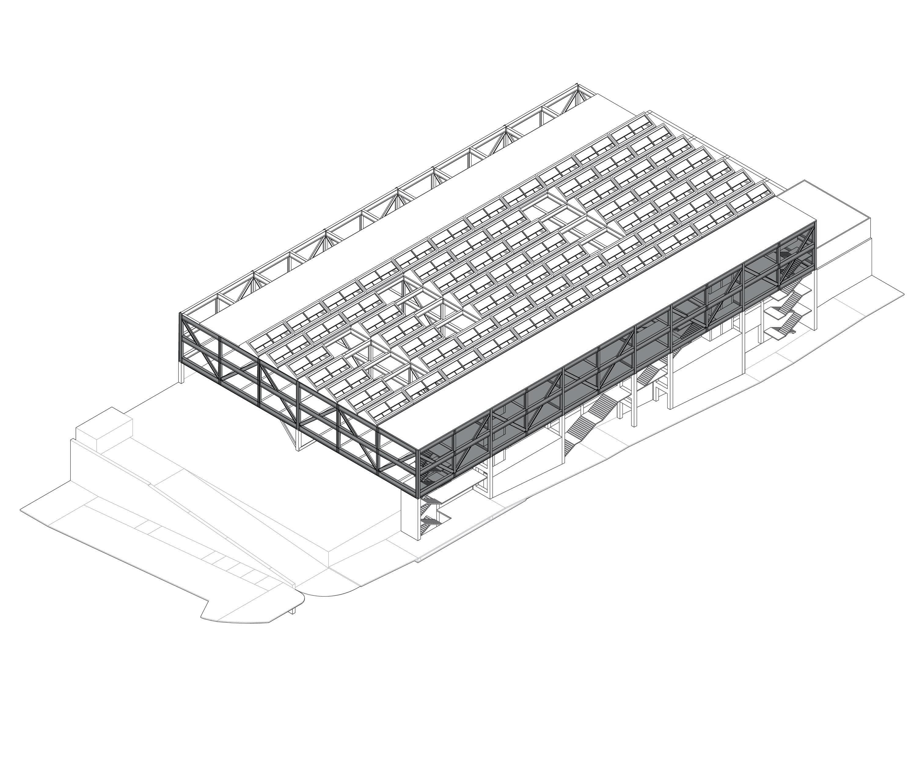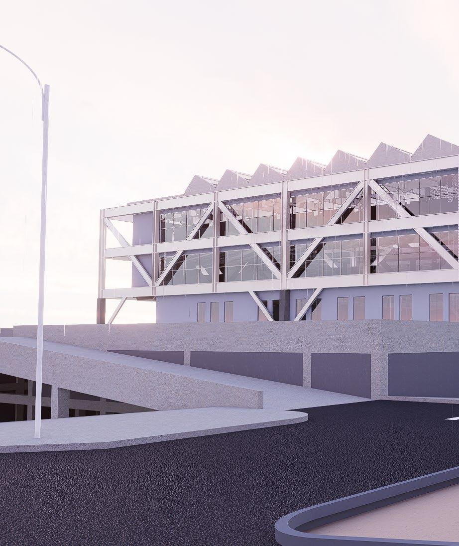 En el contexto de un parque industrial, uno de los problemas en la concepción de un proyecto es la búsqueda de un espacio de construcción que no altere la dinámica de la zona. Ante ello, el proyecto se emplaza encima de un Sodimac, con la finalidad de no solo construir un edificio, sino generar un hito en el parque industrial que pueda suplir las necesidades actuales de la zona. Para ello, el proyecto genera una estructura replicable, que se extiende a lo largo de toda la extensión del Sodimac mediante la construcción de una viga Vierendeel, que permite articular las funciones en sectores transversales, generando así tiras de programa.