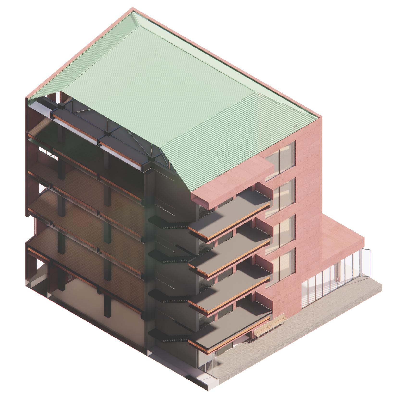 El taller se enfoca en la construcción de un edificio desde la forma y el sistema constructivo, de manera que se genera un modelo replicable en el que los usos insertados se pueden transformar con el tiempo.
