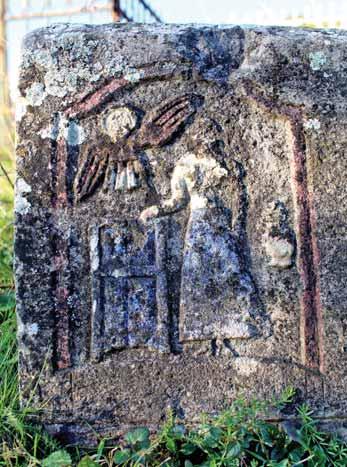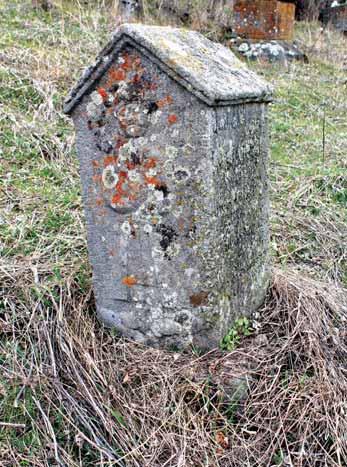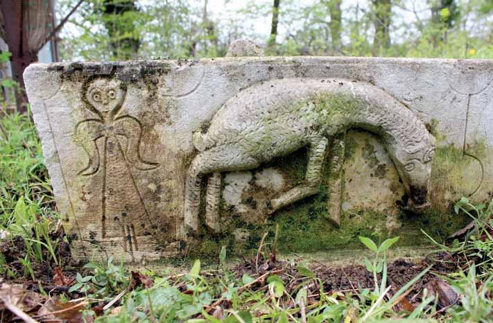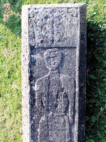 depiction of a man holding the handle of a jug in one hand. The distinctive manner in which the oval shape of the man’s face, his eyes, and eyebrows are depicted, is almost identical to the figures in the late medieval monumental relief sculptures, where the distinctive features include high cheekbones, thick, arched eyebrows closely linked to a wide nose, raised eyeballs surrounded with a thick contour, and short, thin lips. Thus, the carefully dated epitaph accompanying this particular gravestone may become our guide for dating those other gravestones without epitaphs which share the same style; the process is particularly difficult in the case of folk artworks.