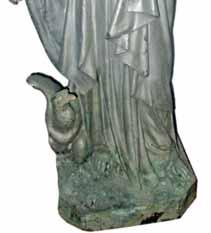 the toes of his shoes pointing outward. The bishop is holding his arms crossed over his abdomen, slightly below his chest. His palms are carved smoothly in bas-relief, while his long, elegant fingers are bevelled